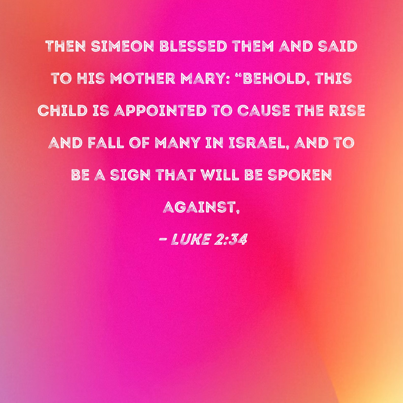 Luke 2:34 Then Simeon blessed them and said to His mother Mary: "Behold, this Child is appointed to cause the rise and fall of many in Israel, and to be a sign that will be spoken against,