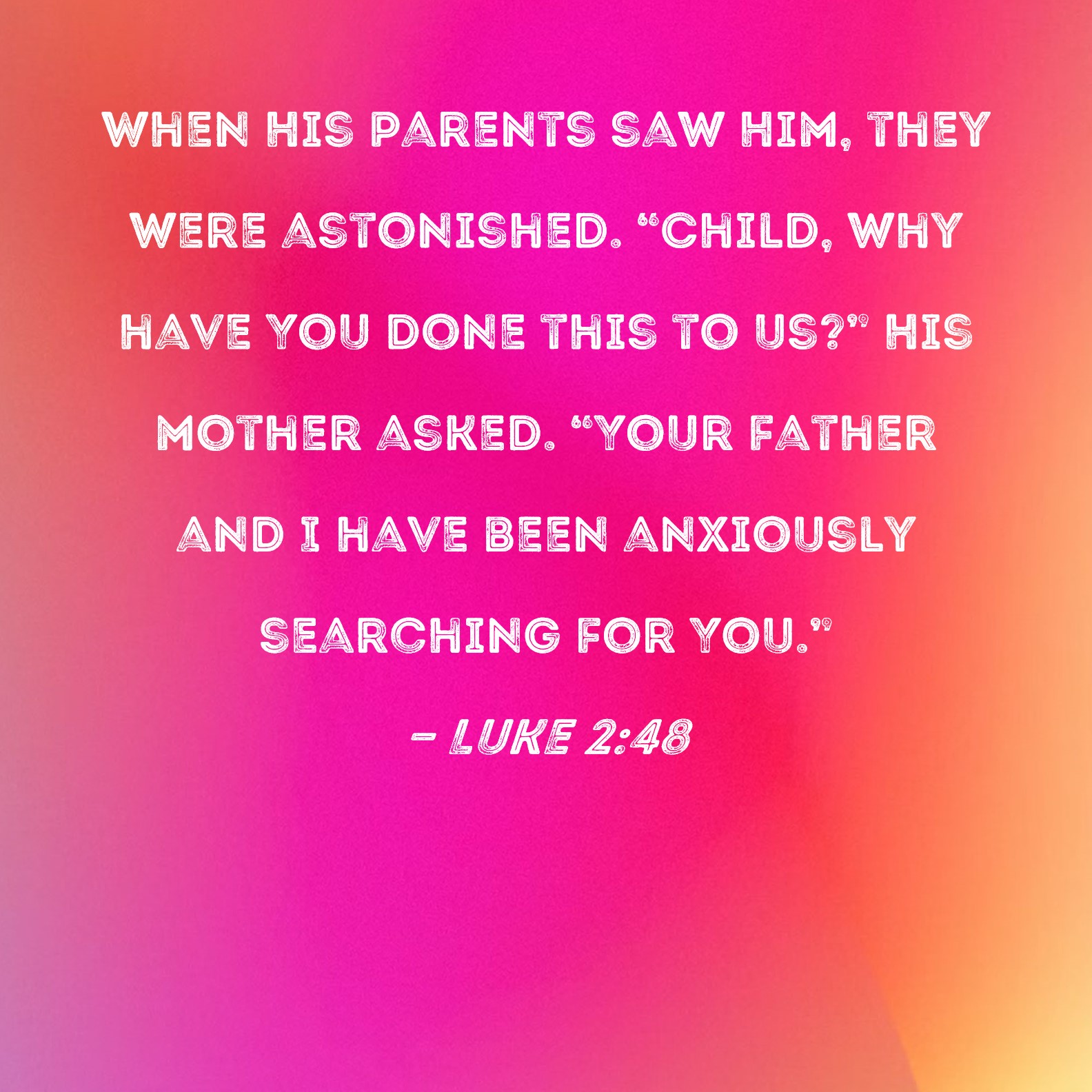 Luke 2:48 When His parents saw Him, they were astonished. "Child, why have You done this to us?" His mother asked. "Your father and I have been anxiously searching for You."