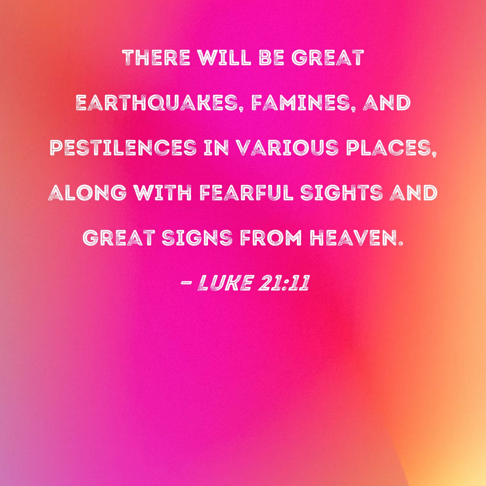 Luke 21:11 There will be great earthquakes, famines, and pestilences in various places, along with fearful sights and great signs from heaven.