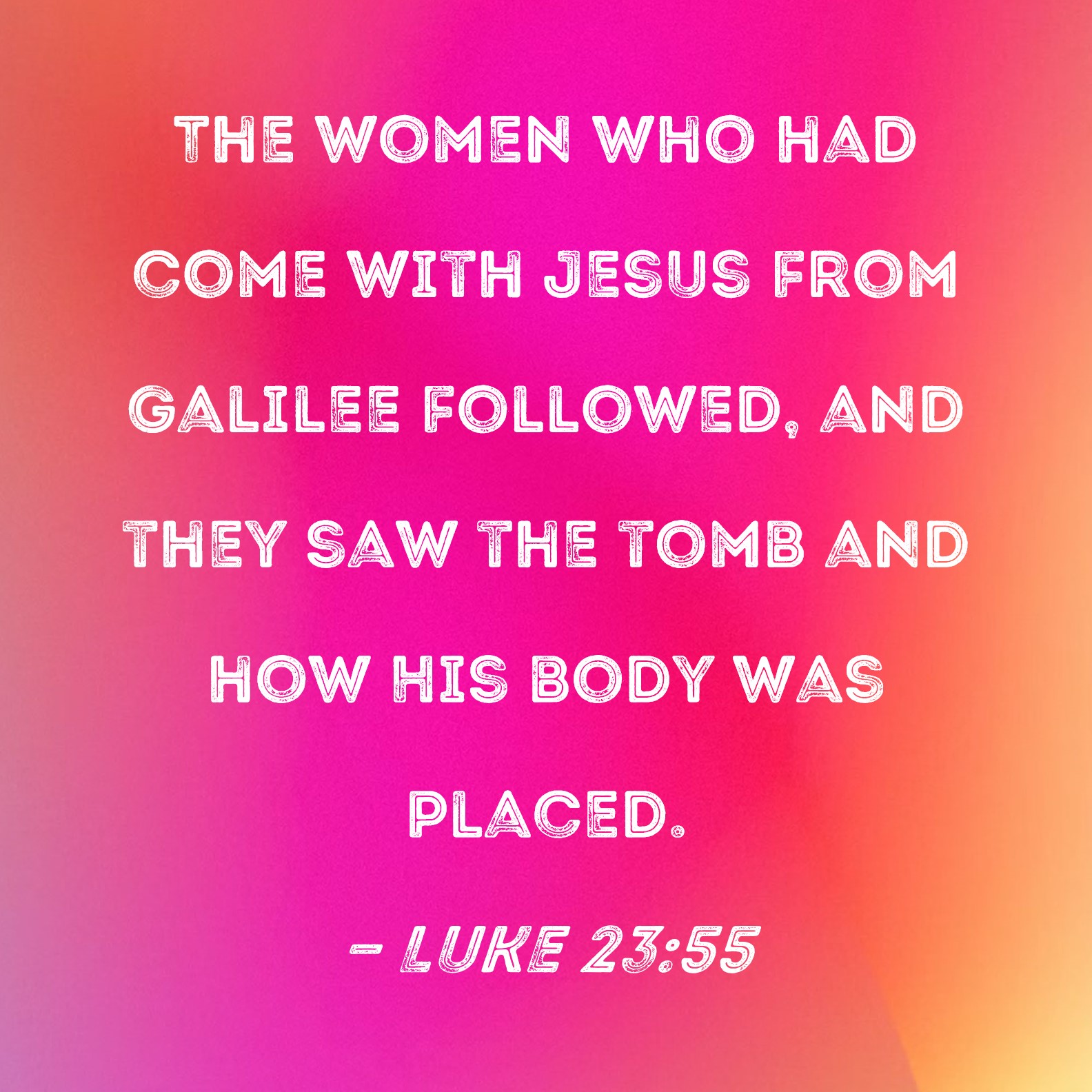 Luke 23:55 The women who had come with Jesus from Galilee followed, and they saw the tomb and how His body was placed.
