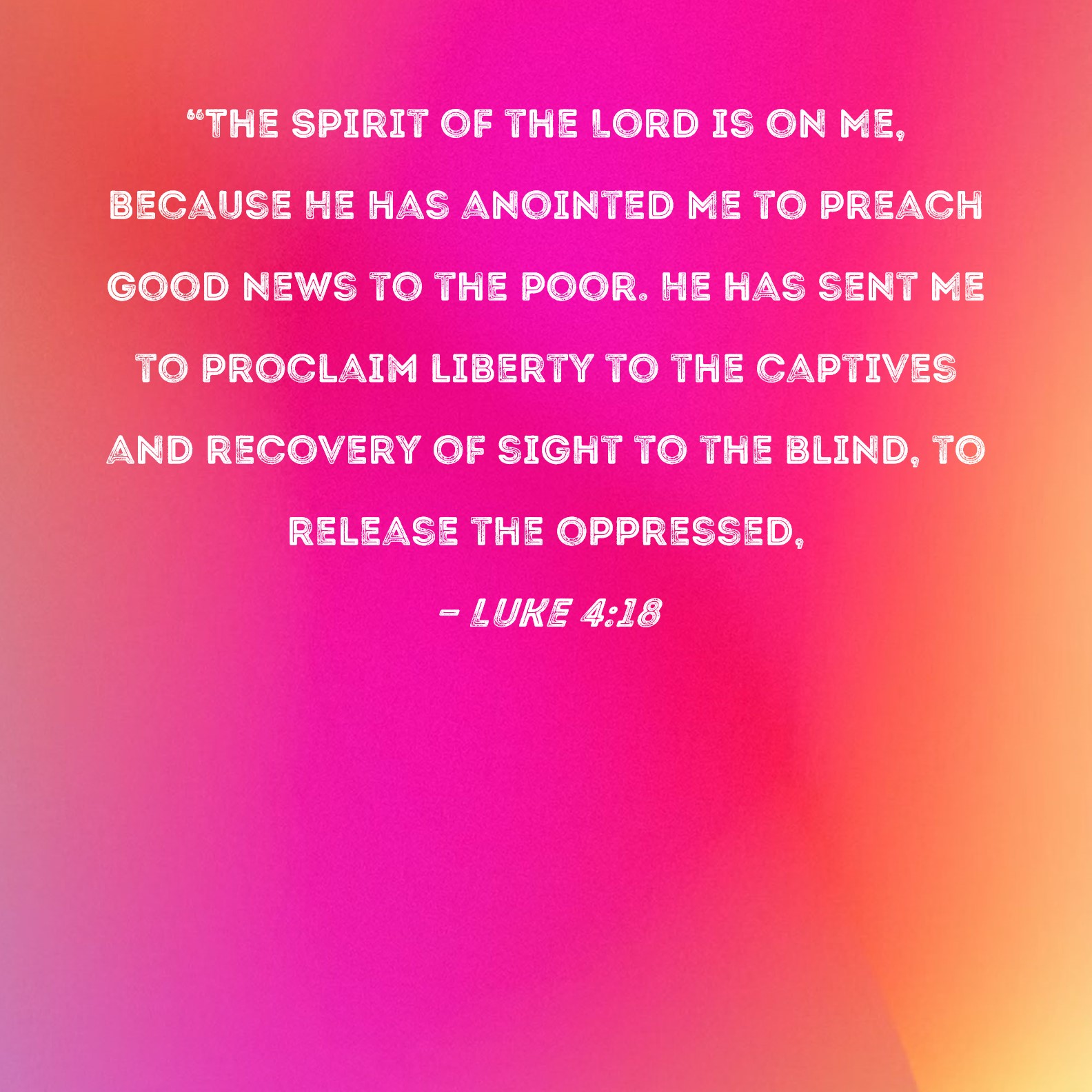 Luke 4:18 "The Spirit of the Lord is on Me, because He has anointed Me to preach good news to the poor. He has sent Me to proclaim liberty to the captives and recovery of sight to the blind, to release the oppressed,