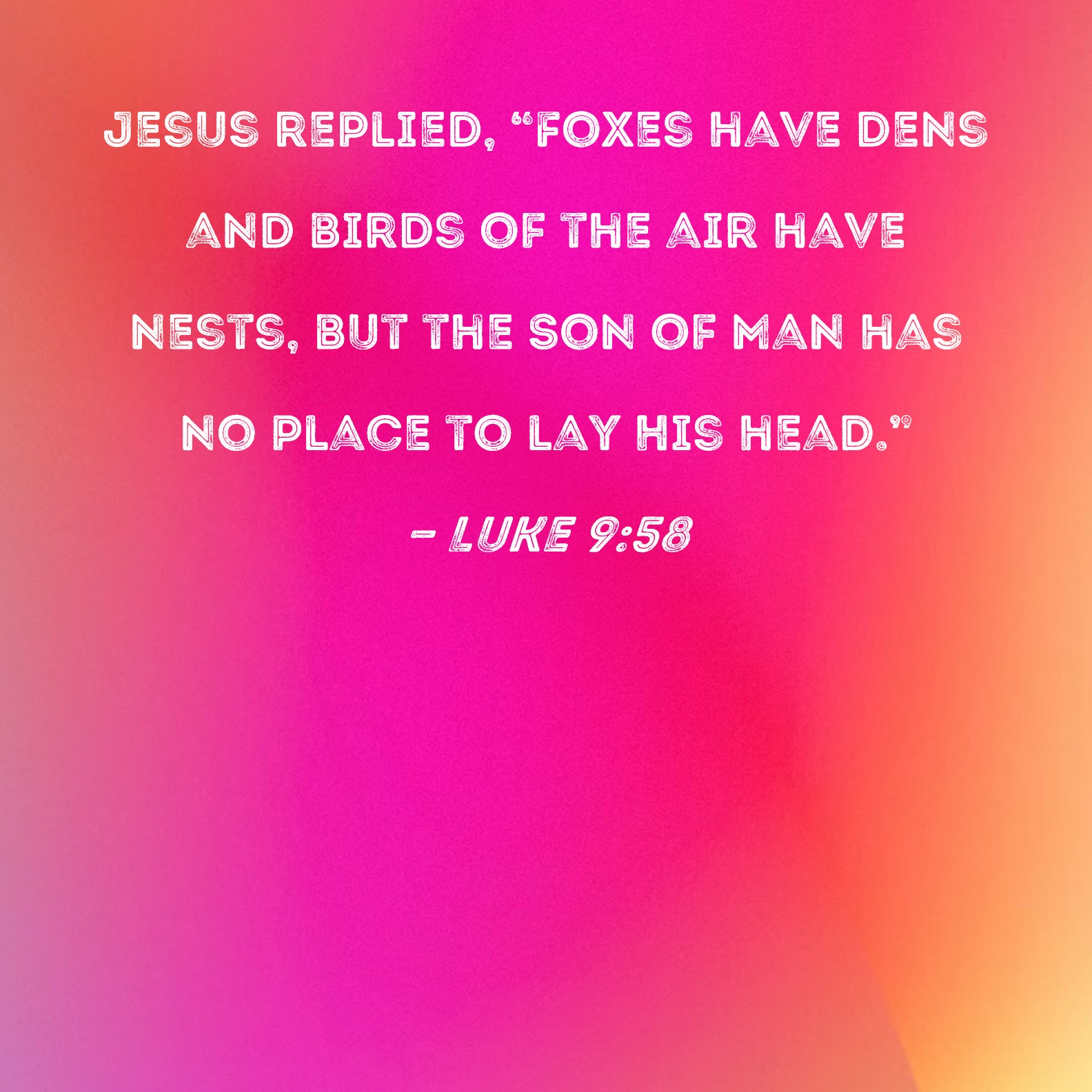 Luke 9:58 Jesus replied, "Foxes have dens and birds of the air have nests, but the Son of Man has no place to lay His head."
