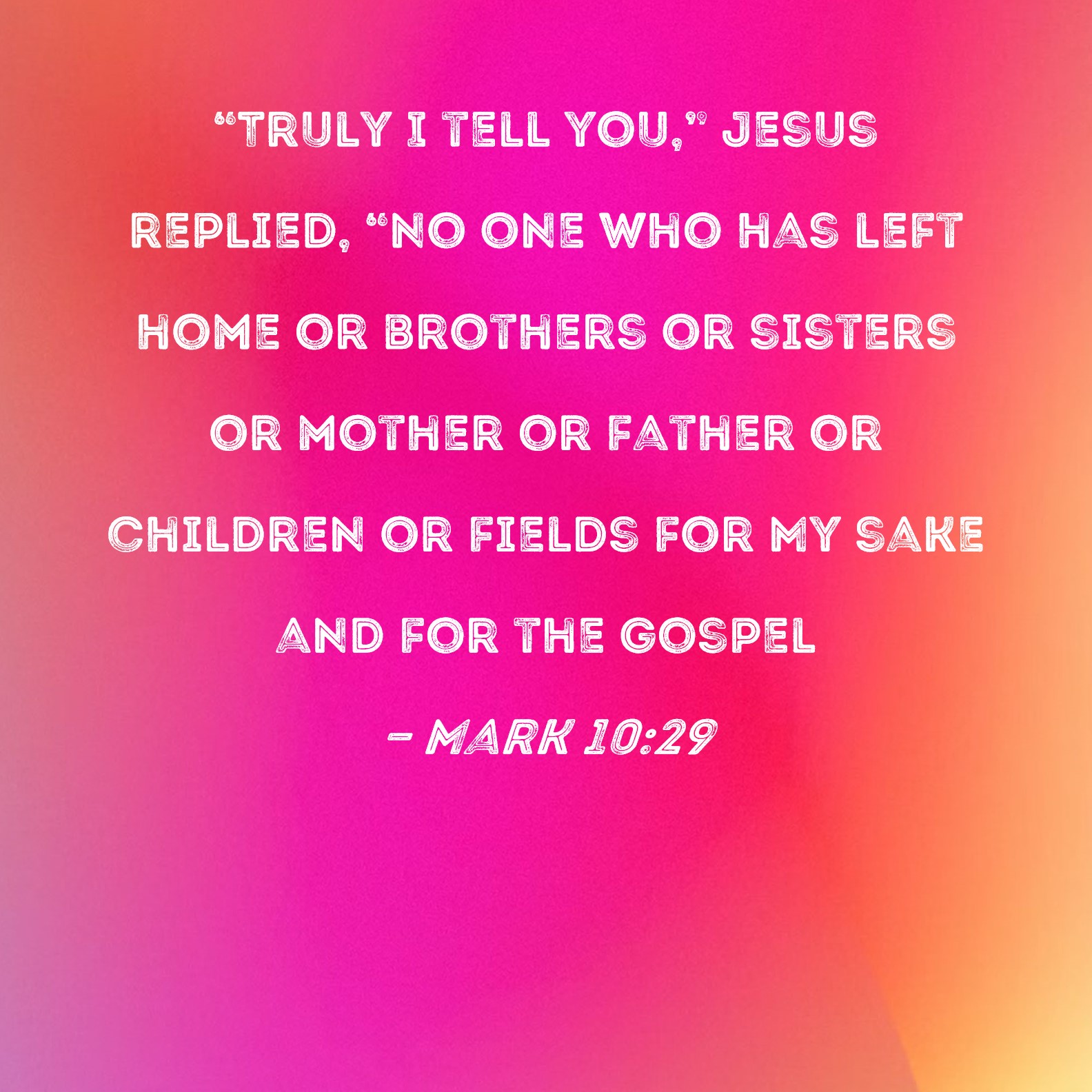 Mark 10:29 "Truly I tell you," Jesus replied, "no one who has left home or brothers or sisters or mother or father or children or fields for My sake and for the gospel