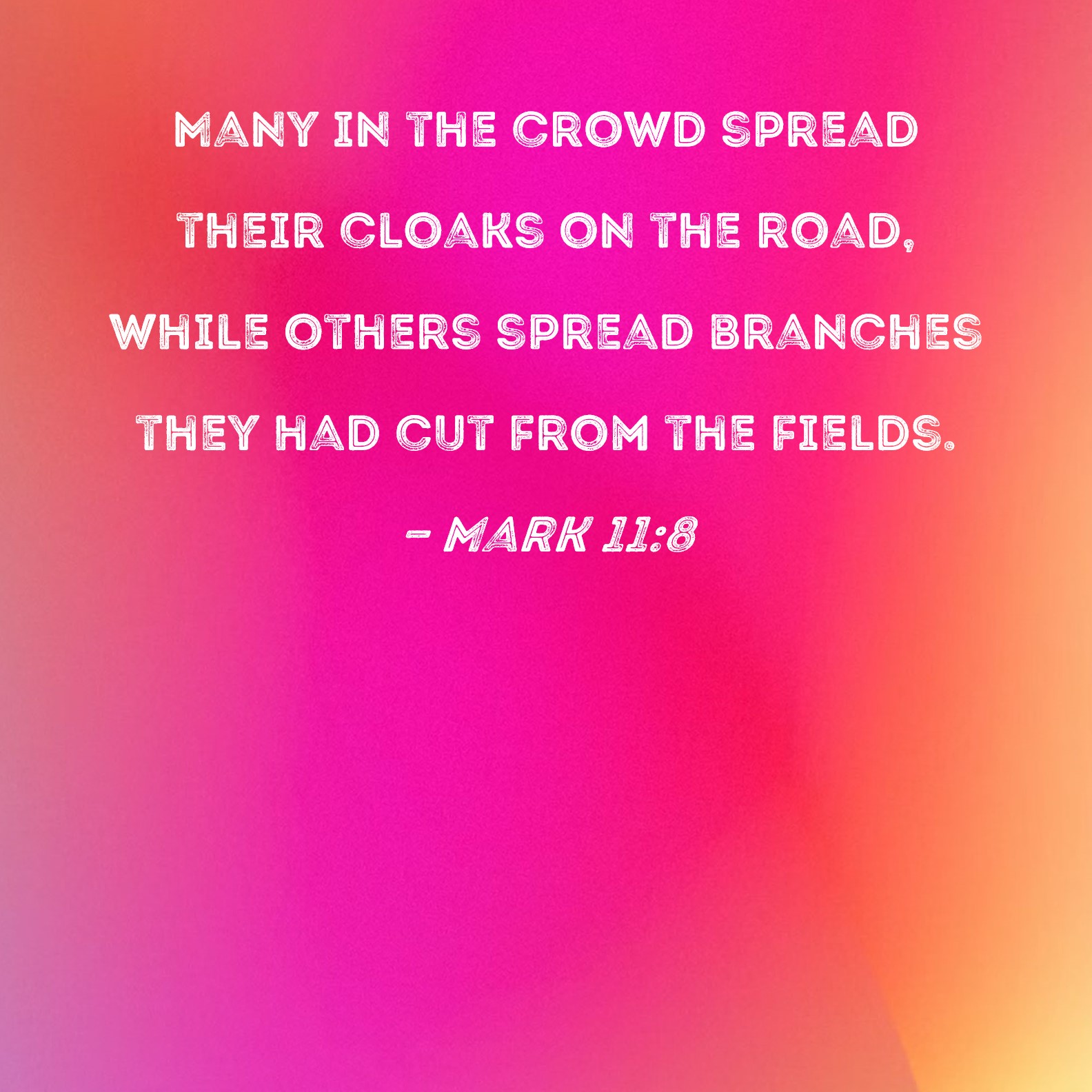 Mark 11:8 Many in the crowd spread their cloaks on the road, while others spread branches they had cut from the fields.