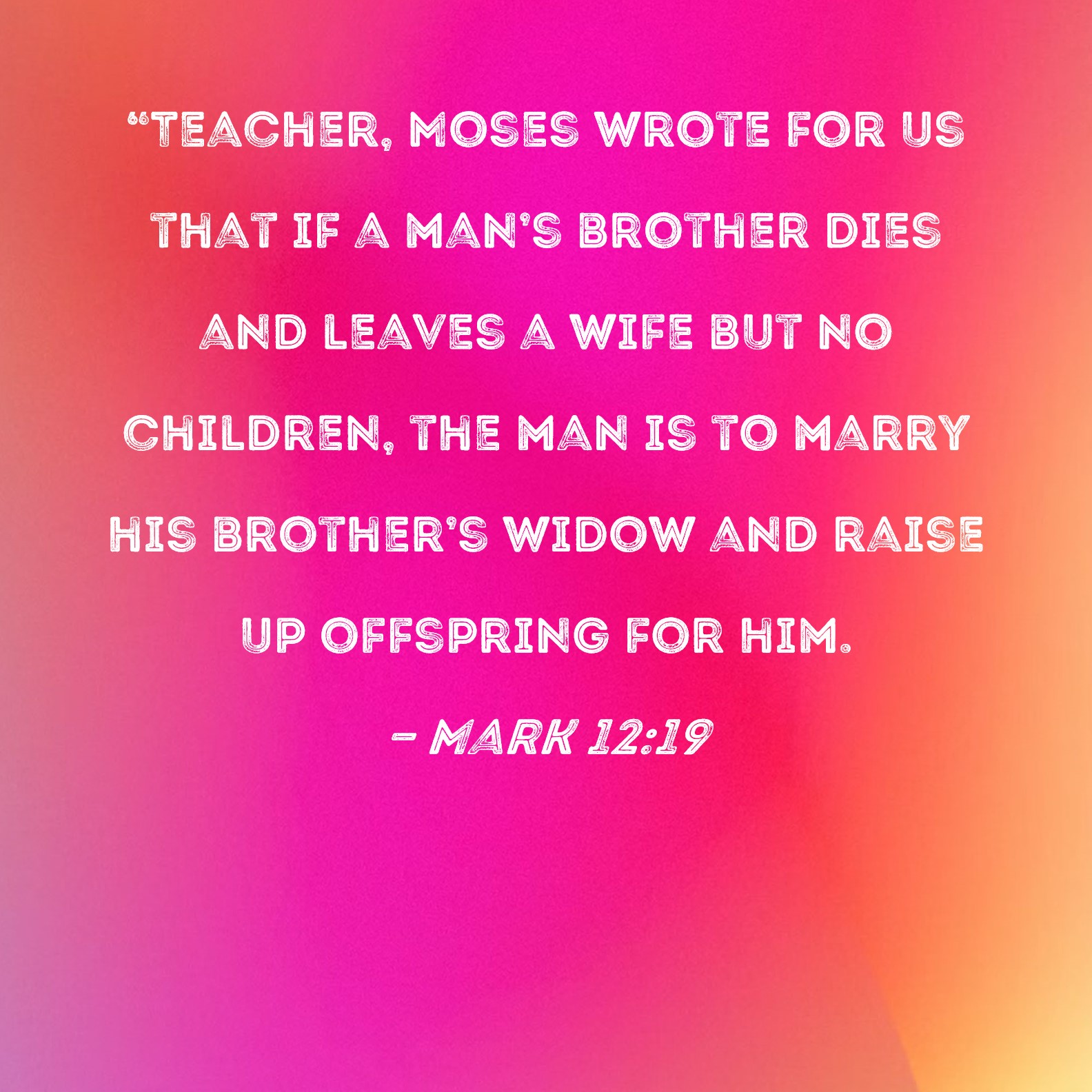 Mark 12:19 "Teacher, Moses wrote for us that if a man's brother dies and leaves a wife but no children, the man is to marry his brother's widow and raise up offspring for him.