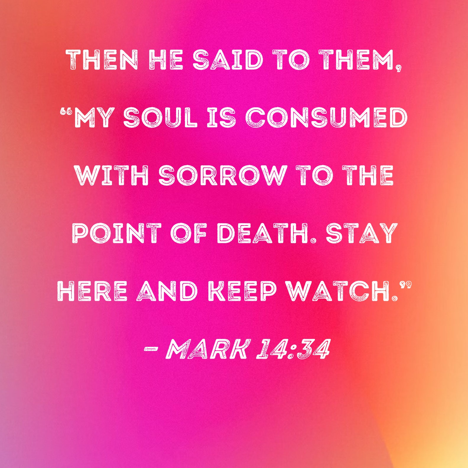 Mark 14:34 Then He said to them, "My soul is consumed with sorrow to the point of death. Stay here and keep watch."