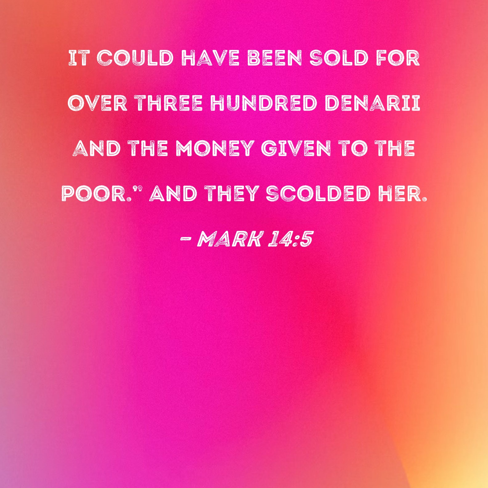 Mark 14:5 It could have been sold for over three hundred denarii and the money given to the poor." And they scolded her.