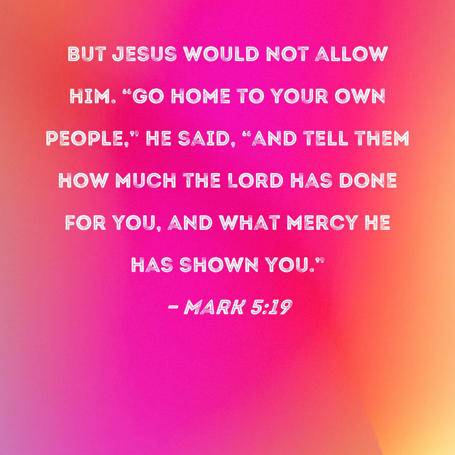 Mark 5:19 But Jesus would not allow him. "Go home to your own people," He said, "and tell them how much the Lord has done for you, and what mercy He has shown you."