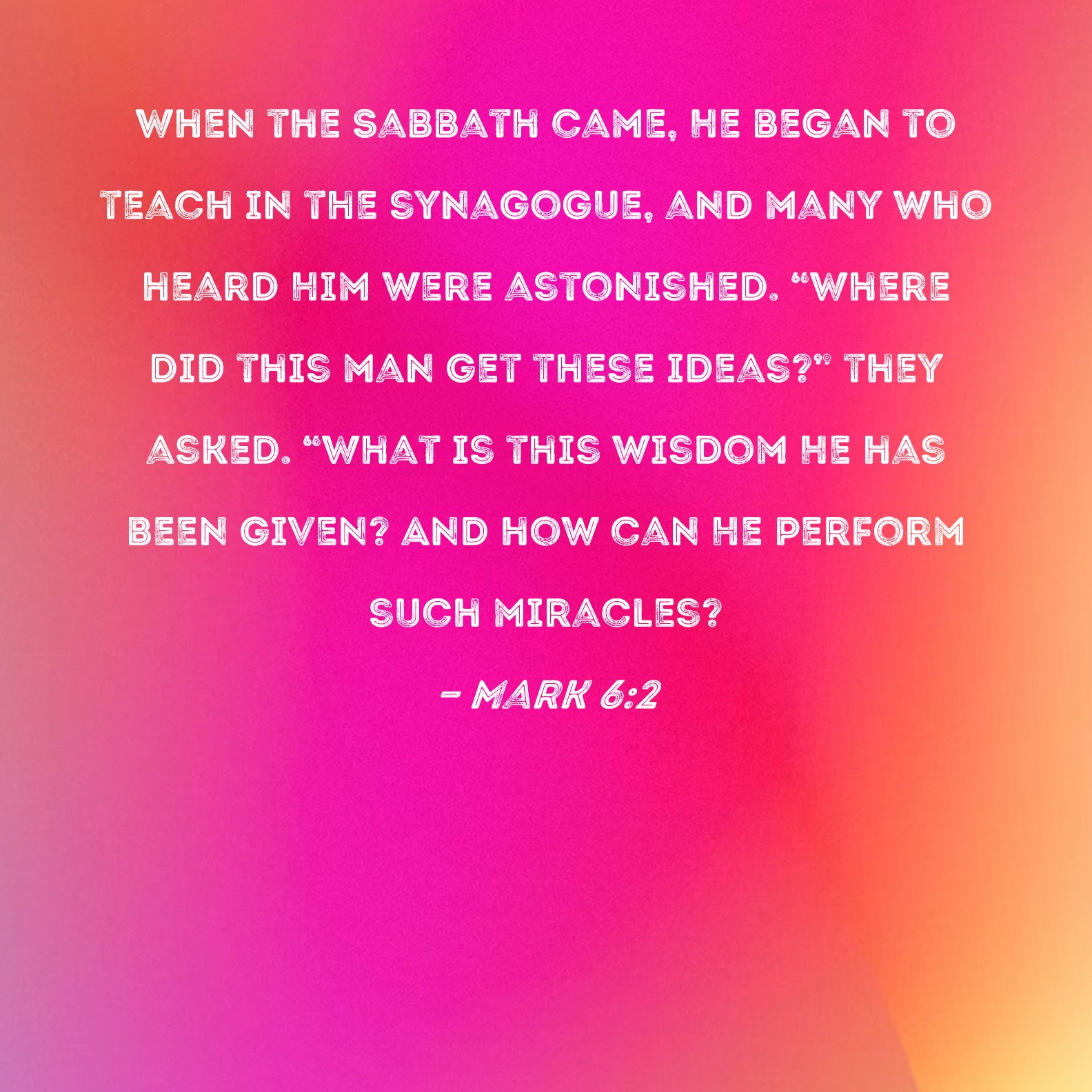 Mark 6:2 When the Sabbath came, He began to teach in the synagogue, and many who heard Him were astonished. "Where did this man get these ideas?" they asked. "What is this wisdom He has been given? And how can He perform such miracles?