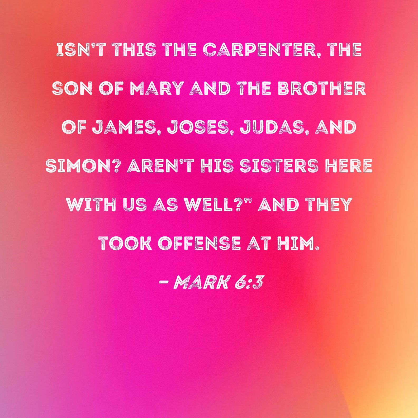 Mark 6:3 Isn't this the carpenter, the son of Mary and the brother of James, Joses, Judas, and Simon? Aren't His sisters here with us as well?" And they took offense at Him.