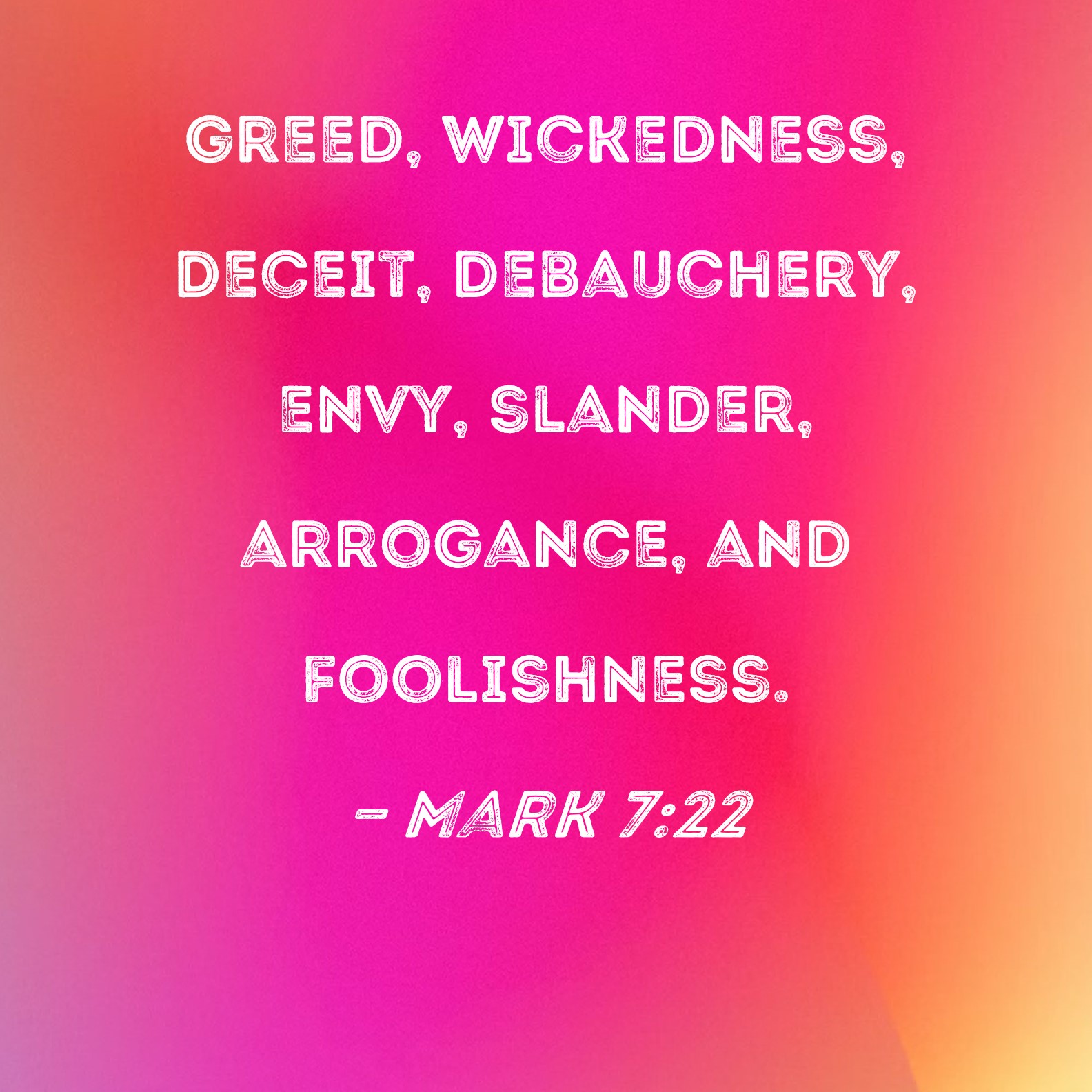 Mark 7:22 greed, wickedness, deceit, debauchery, envy, slander, arrogance, and foolishness.