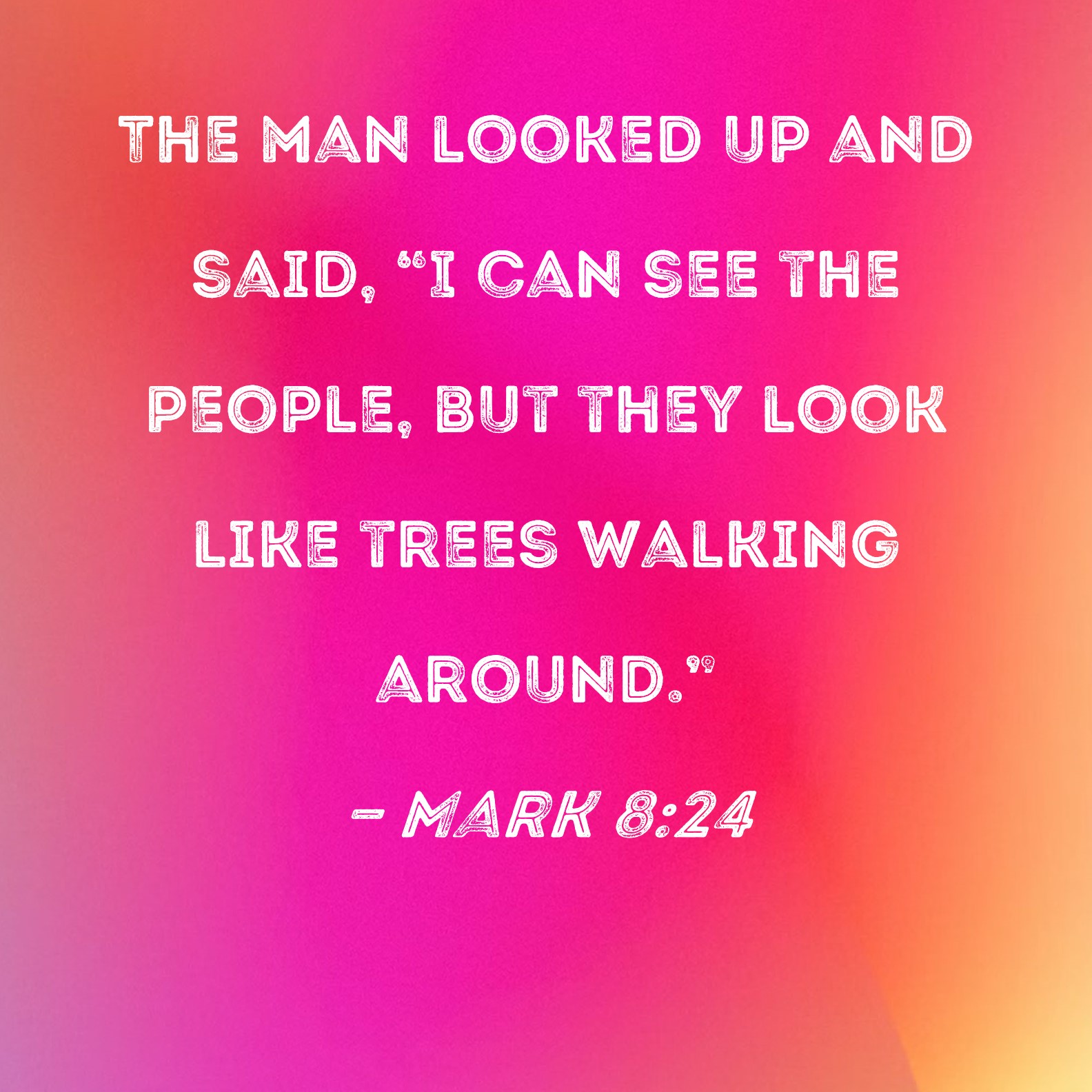 Mark 8:24 The man looked up and said, "I can see the people, but they look like trees walking around."