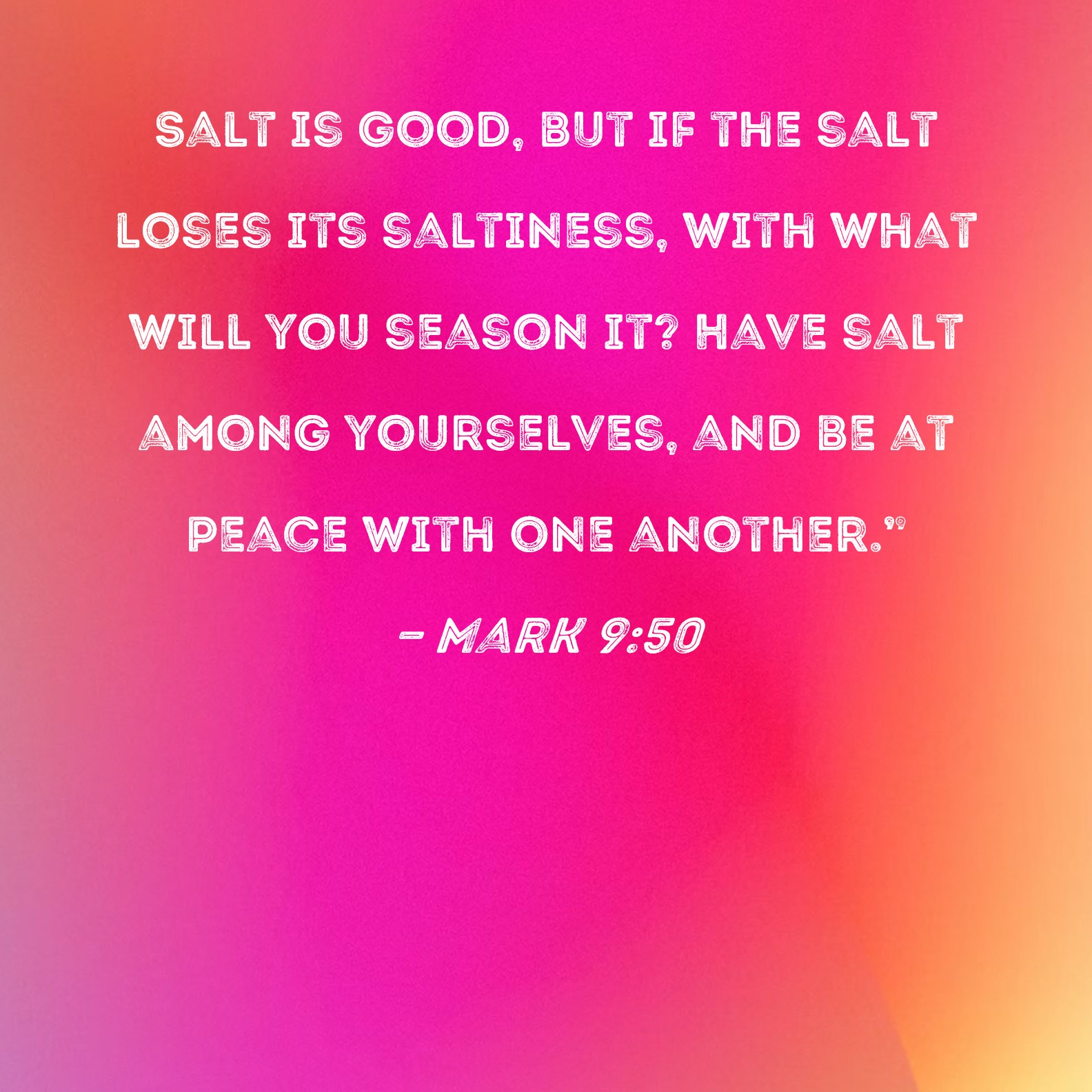 Mark 9:50 Salt is good, but if the salt loses its saltiness, with what will you season it? Have salt among yourselves, and be at peace with one another."