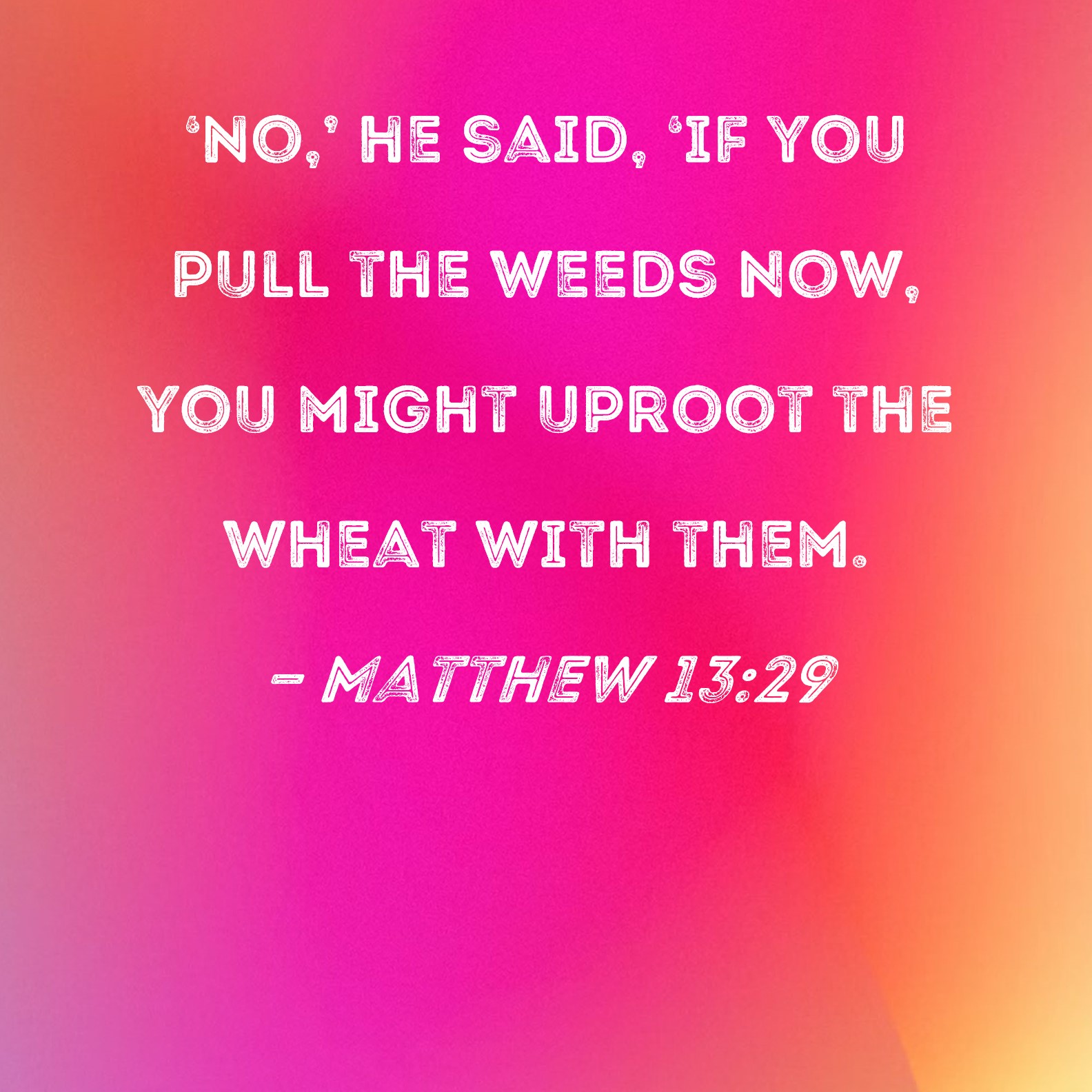 Matthew 13:29 No,' he said, 'if you pull the weeds now, you might uproot the wheat with them.
