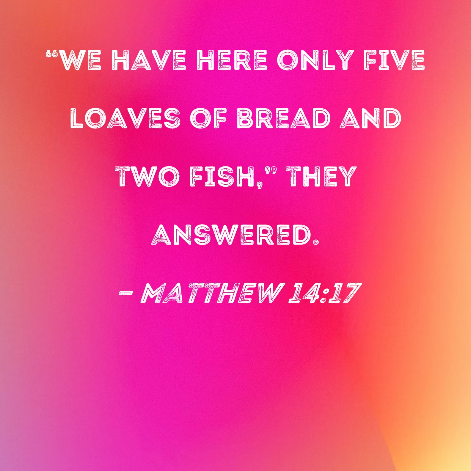 BSB: "We have here only five loaves of bread and two fish," they answered. KJV: And they say unto him, We have here but five loaves, and two fishes. DRB: They answered him: We have not here, but five loaves, and two fishes. DBT: But they say to him, We have not here save five loaves and two fishes. ERV: And they say unto him, We have here but five loaves, and two fishes. WBT: And they say to him, We have here but five loaves, and two fishes. WEB: They told him, “We only have here five loaves and two fish.” YLT: And they say to him, 'We have not here except five loaves, and two fishes.'Links Matthew 14:17 NIV • Matthew 14:17 NLT • Matthew 14:17 ESV • Matthew 14:17 NASB • Matthew 14:17 KJV • Matthew 14:17 Interlinear • Matthew 14:17 Commentaries • Matthew 14:17 Parallel Texts • Matthew 14:17 Bible Apps • Matthew 14:17 Parallel • Bible Hub |