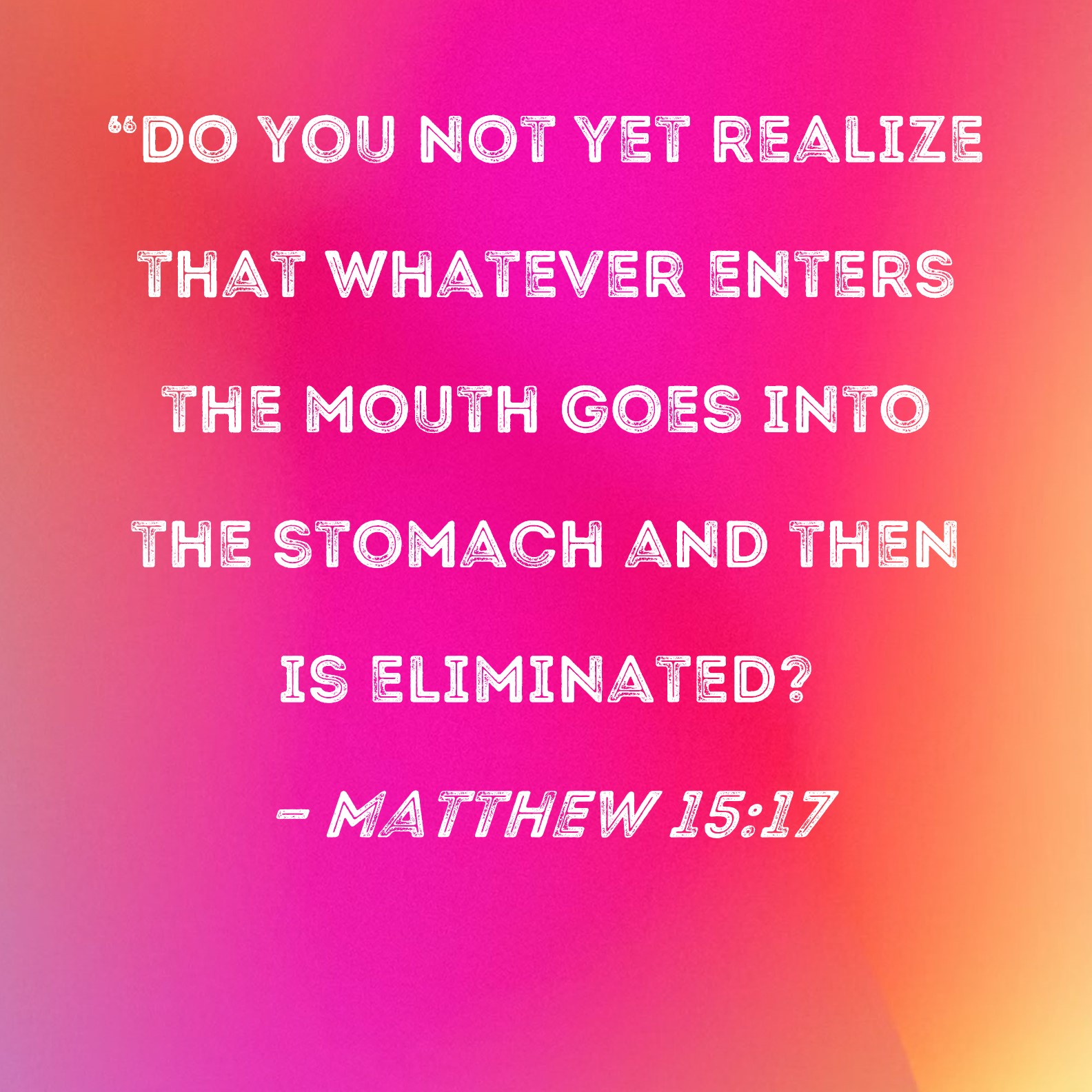 Matthew 15:17 "Do you not yet realize that whatever enters the mouth goes into the stomach and then is eliminated?