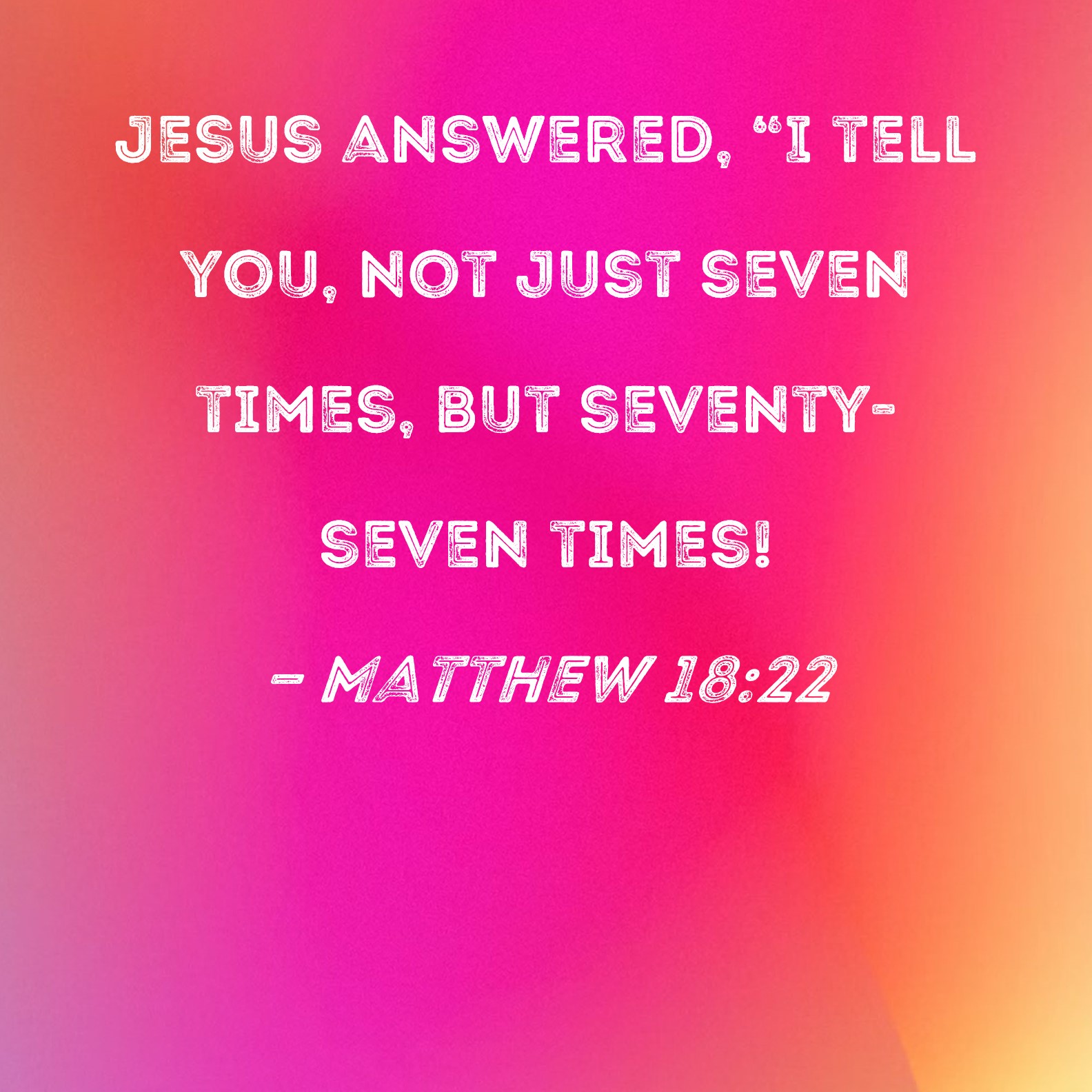 Matthew 18:22 Jesus answered, "I tell you, not just seven times, but seventy-seven times!
