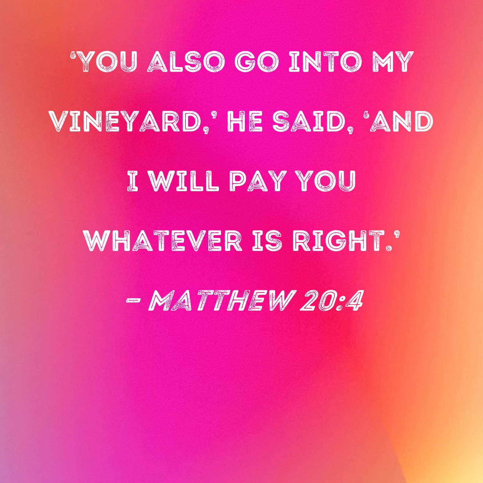 Matthew 20:4 You also go into my vineyard,' he said, 'and I will pay you whatever is right.'