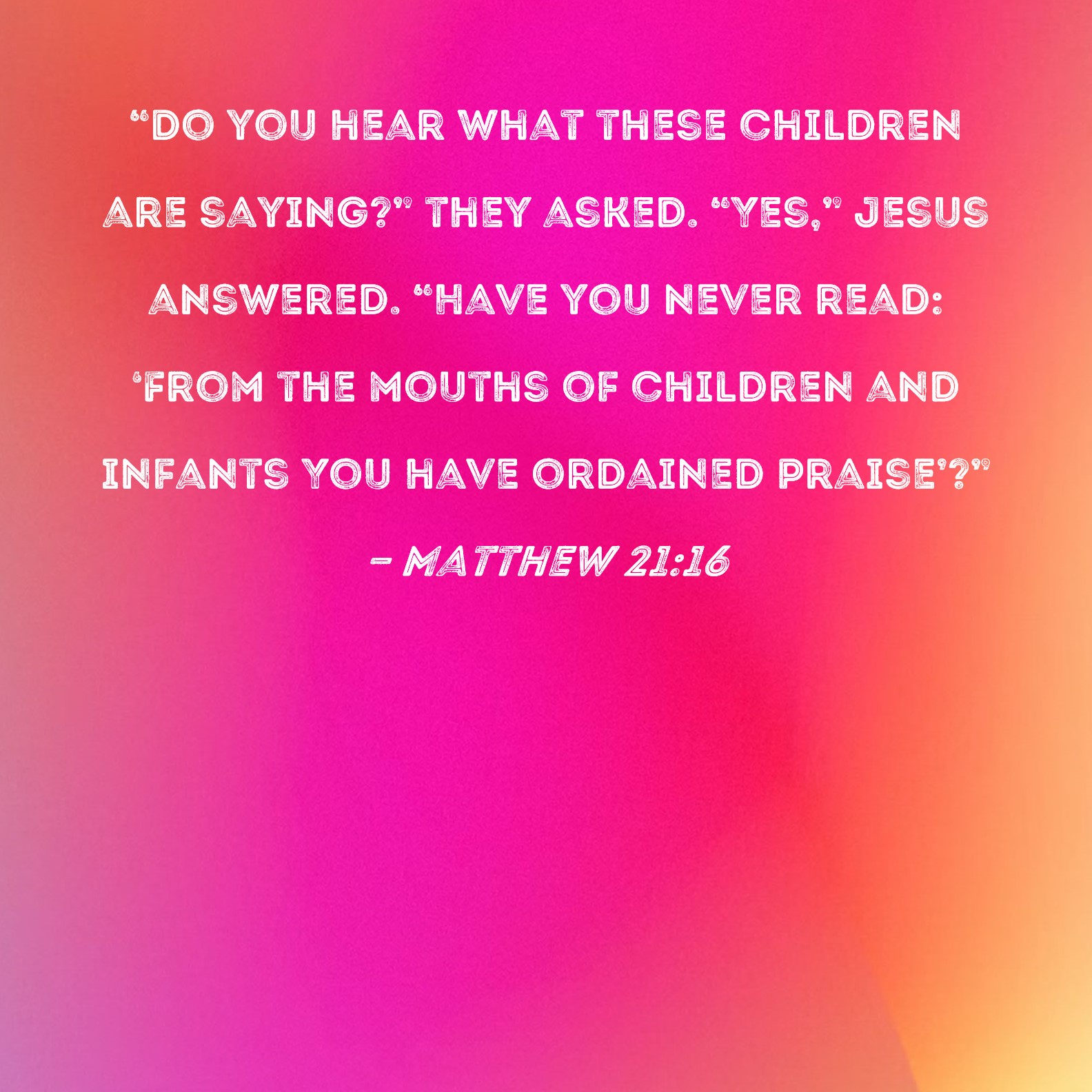 Matthew 21:16 "Do you hear what these children are saying?" they asked. "Yes," Jesus answered. "Have you never read: 'From the mouths of children and infants You have ordained praise'?"