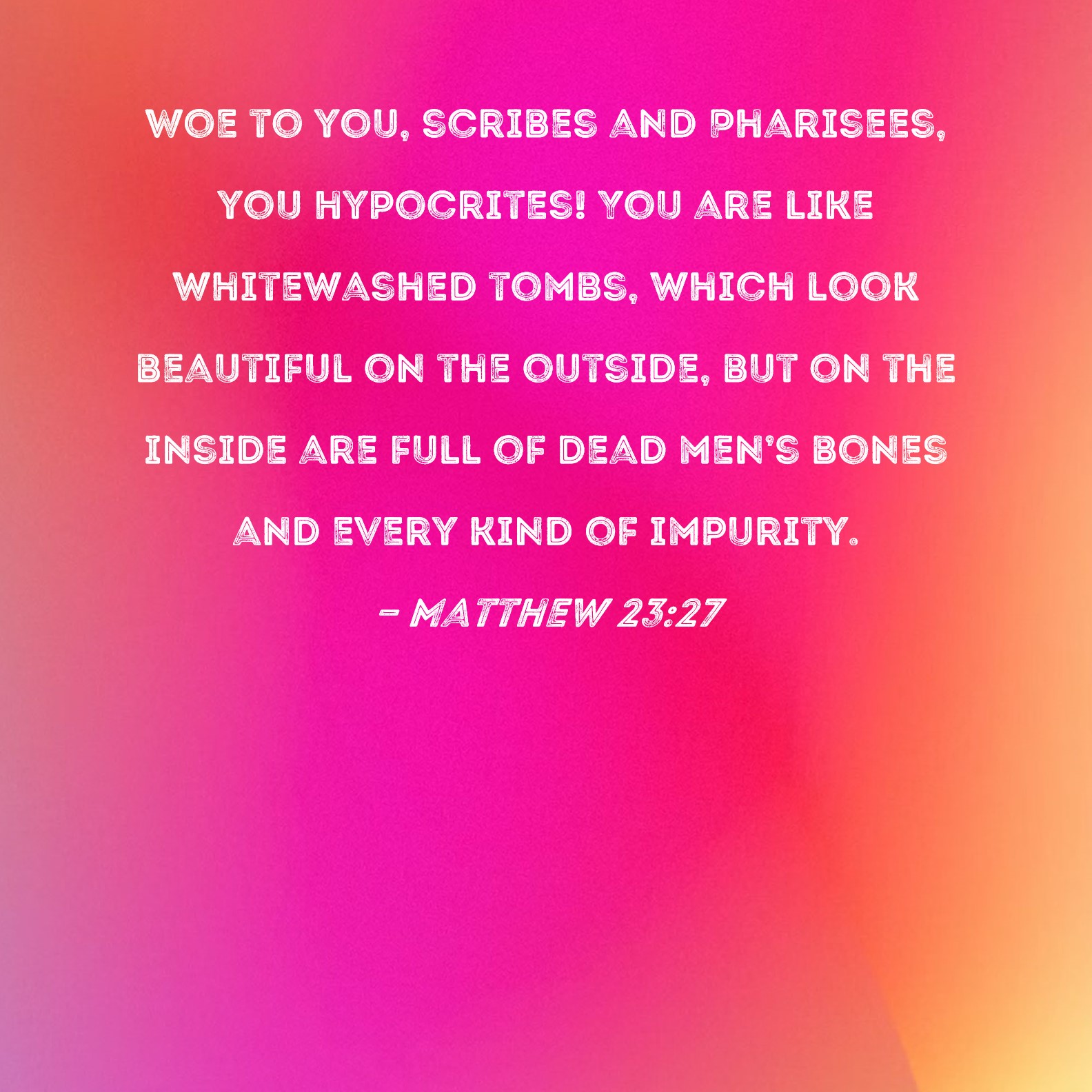 Matthew 23:27 Woe to you, scribes and Pharisees, you hypocrites! You are like whitewashed tombs, which look beautiful on the outside, but on the inside are full of dead men's bones and every kind of impurity.