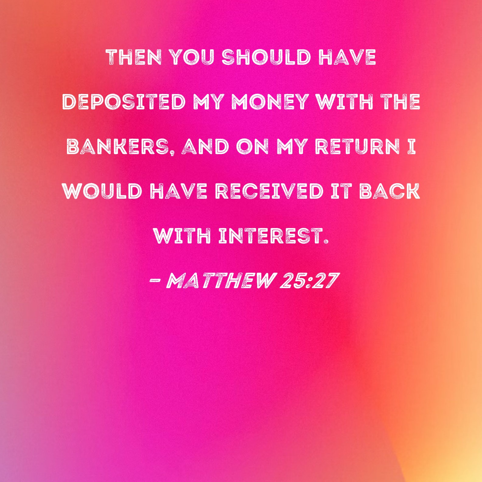 Matthew 25:27 Then you should have deposited my money with the bankers, and on my return I would have received it back with interest.