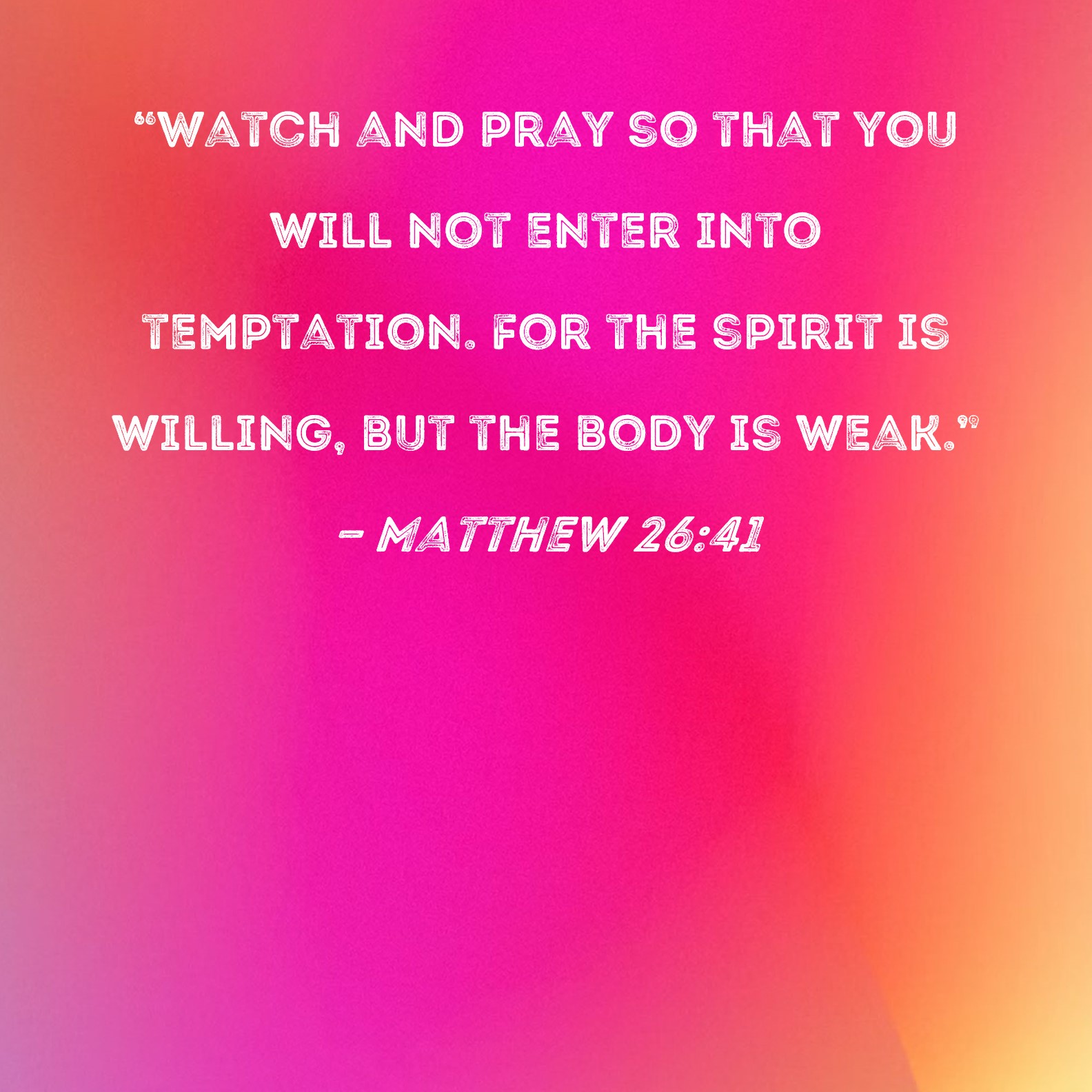 BSB: "Watch and pray so that you will not enter into temptation. For the spirit is willing, but the body is weak." KJV: Watch and pray, that ye enter not into temptation: the spirit indeed is willing, but the flesh is weak. DRB: Watch ye, and pray that ye enter not into temptation. The spirit indeed is willing, but the flesh weak. DBT: Watch and pray, that ye enter not into temptation: the spirit indeed is ready, but the flesh weak. ERV: Watch and pray, that ye enter not into temptation: the spirit indeed is willing, but the flesh is weak. WBT: Watch and pray, that ye enter not into temptation: the spirit indeed is willing, but the flesh is weak. WEB: Watch and pray, that you don’t enter into temptation. The spirit indeed is willing, but the flesh is weak.” YLT: watch, and pray, that ye may not enter into temptation: the spirit indeed is forward, but the flesh weak.'Links Matthew 26:41 NIV • Matthew 26:41 NLT • Matthew 26:41 ESV • Matthew 26:41 NASB • Matthew 26:41 KJV • Matthew 26:41 Interlinear • Matthew 26:41 Commentaries • Matthew 26:41 Parallel Texts • Matthew 26:41 Bible Apps • Matthew 26:41 Parallel • Bible Hub |