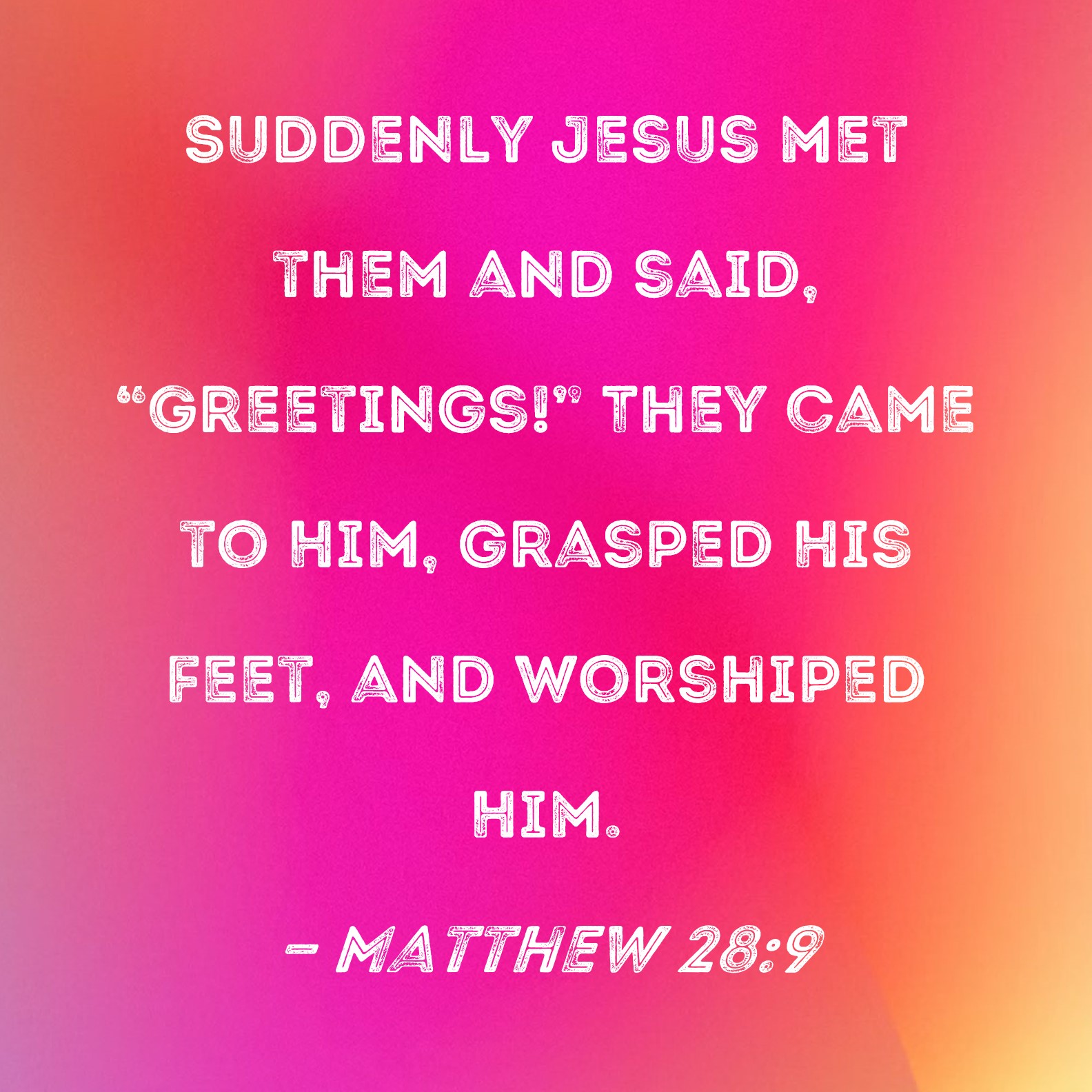 Matthew 28:9 Suddenly Jesus met them and said, "Greetings!" They came to Him, grasped His feet, and worshiped Him.