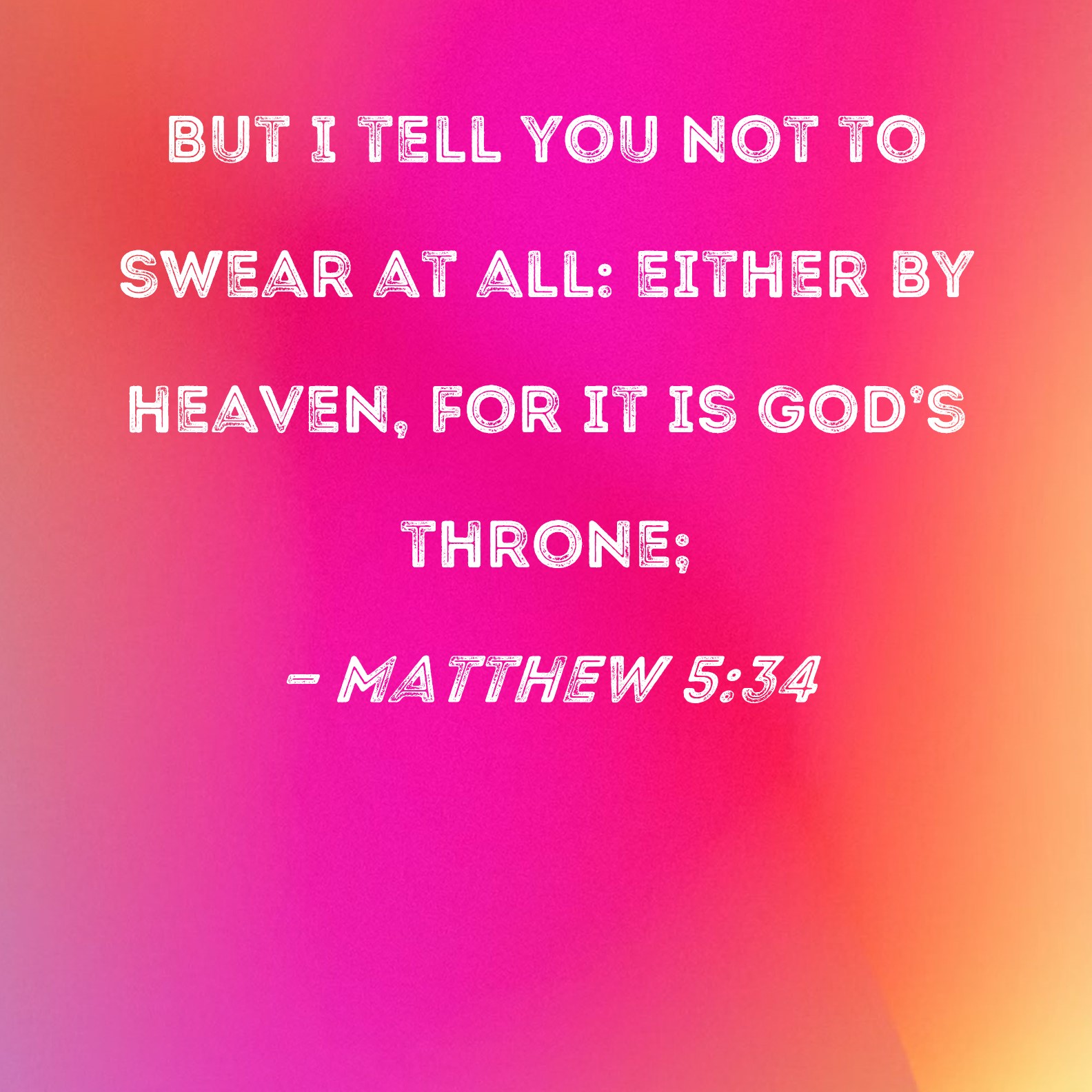 BSB: But I tell you not to swear at all: either by heaven, for it is God's throne; KJV: But I say unto you, Swear not at all; neither by heaven; for it is God's throne: DRB: But I say to you not to swear at all, neither by heaven, for it is the throne of God: DBT: But I say unto you, Do not swear at all; neither by the heaven, because it is the throne of God; ERV: but I say unto you, Swear not at all; neither by the heaven, for it is the throne of God; WBT: But I say to you, Swear not at all: neither by heaven; for it is God's throne: WEB: but I tell you, don’t swear at all: neither by heaven, for it is the throne of God; YLT: but I — I say to you, not to swear at all; neither by the heaven, because it is the throne of God,Links Matthew 5:34 NIV • Matthew 5:34 NLT • Matthew 5:34 ESV • Matthew 5:34 NASB • Matthew 5:34 KJV • Matthew 5:34 Interlinear • Matthew 5:34 Commentaries • Matthew 5:34 Parallel Texts • Matthew 5:34 Bible Apps • Matthew 5:34 Parallel • Bible Hub |