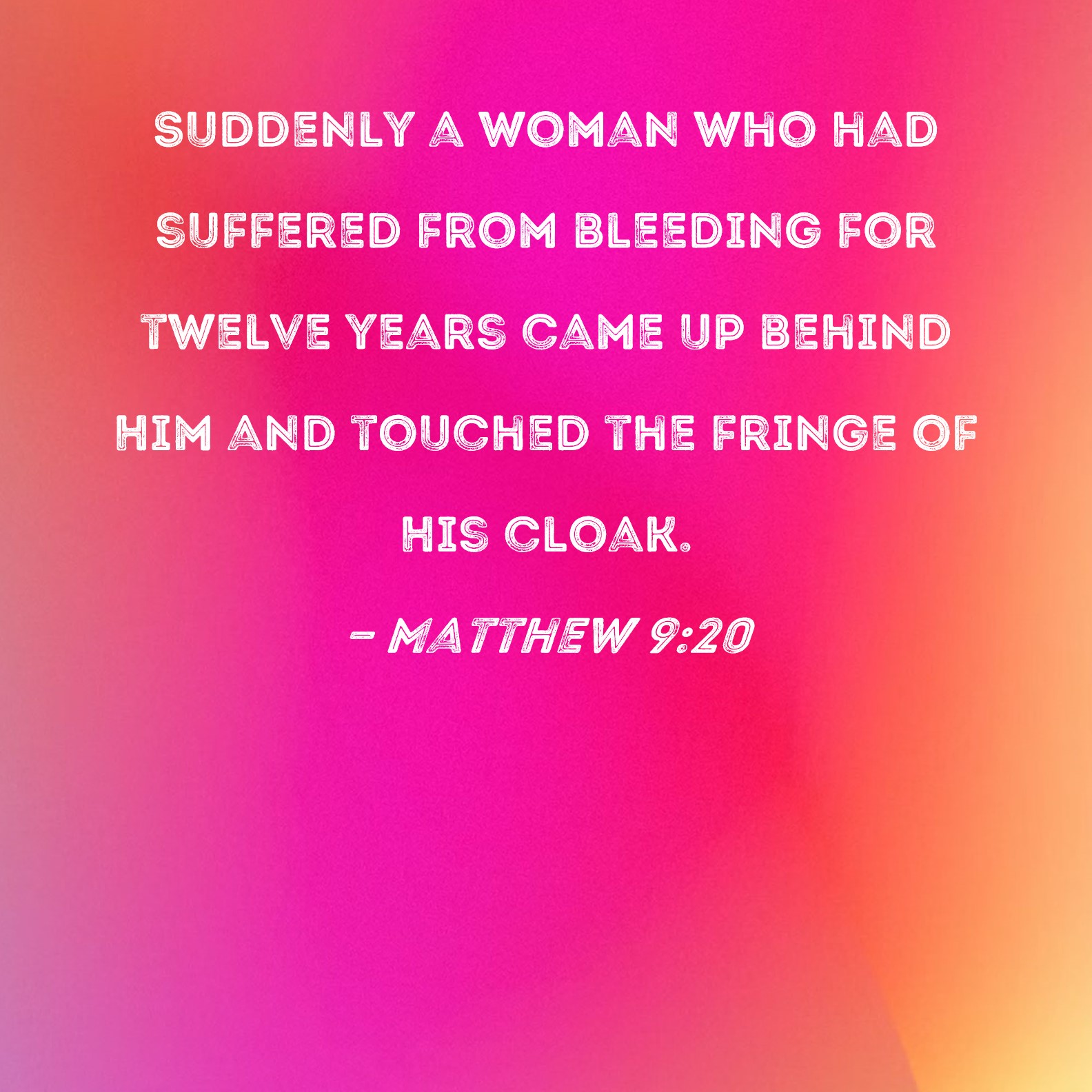 Matthew 9:20 Suddenly a woman who had suffered from bleeding for twelve years came up behind Him and touched the fringe of His cloak.
