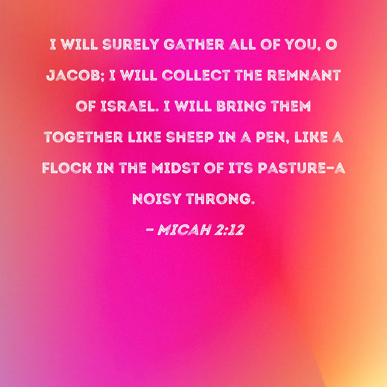 Micah 2:12 I will surely gather all of you, O Jacob; I will collect the remnant of Israel. I will bring them together like sheep in a pen, like a flock in the midst of its pasture--a noisy throng.