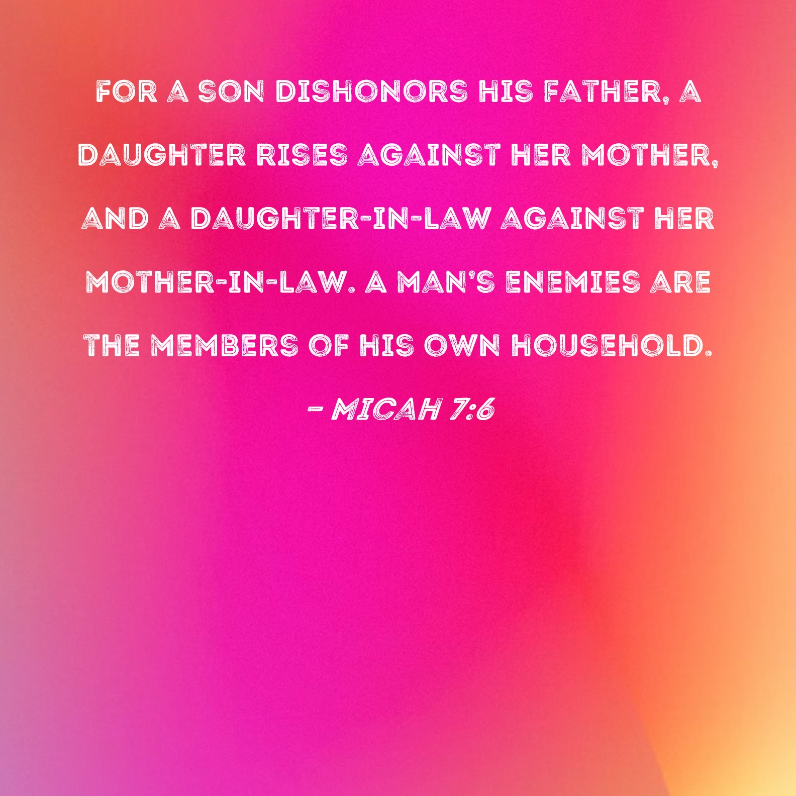 Micah 7:6 For a son dishonors his father, a daughter rises against her mother, and a daughter-in-law against her mother-in-law. A man's enemies are the members of his own household.