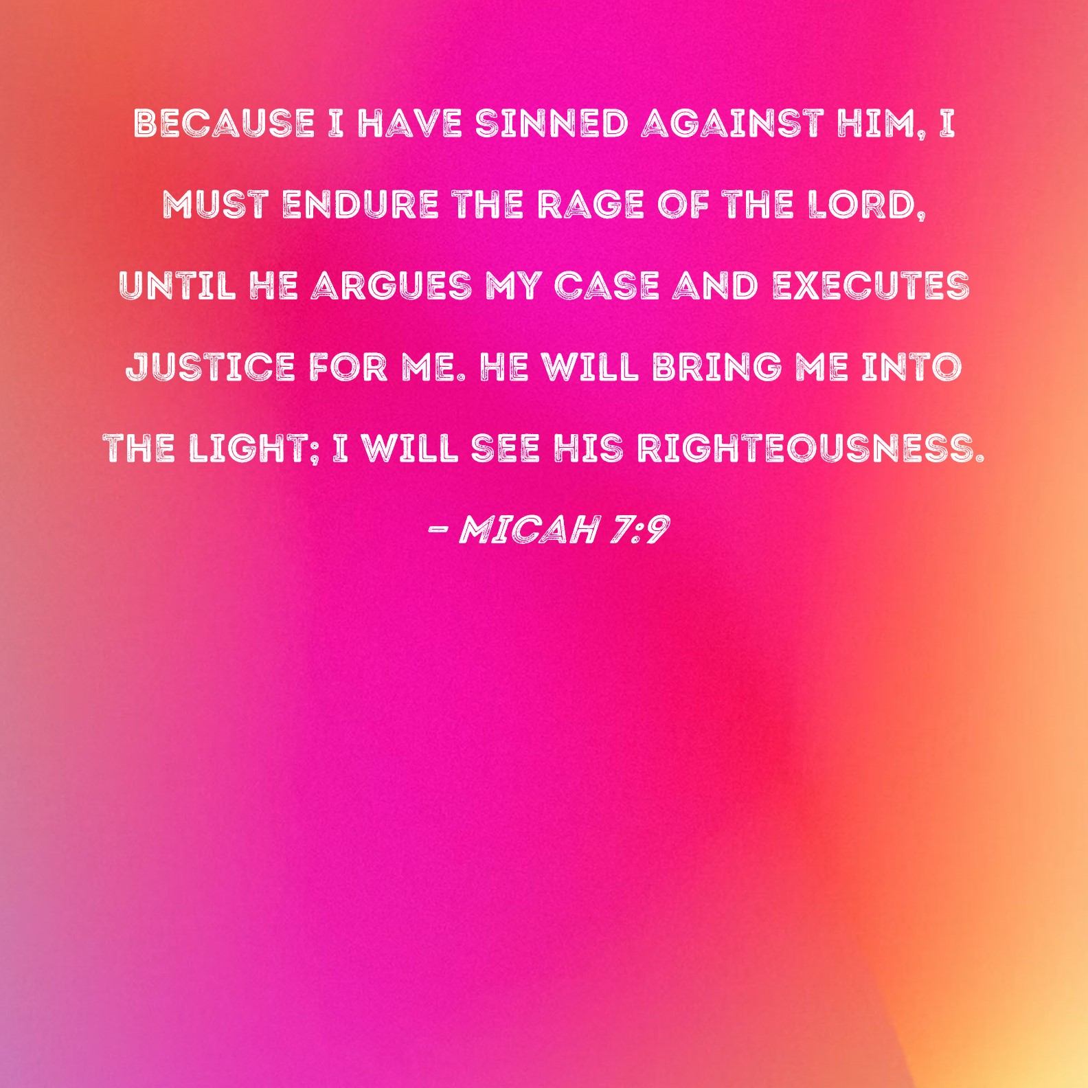 Micah 7:9 Because I have sinned against Him, I must endure the rage of the LORD, until He argues my case and executes justice for me. He will bring me into the light; I will see His righteousness.