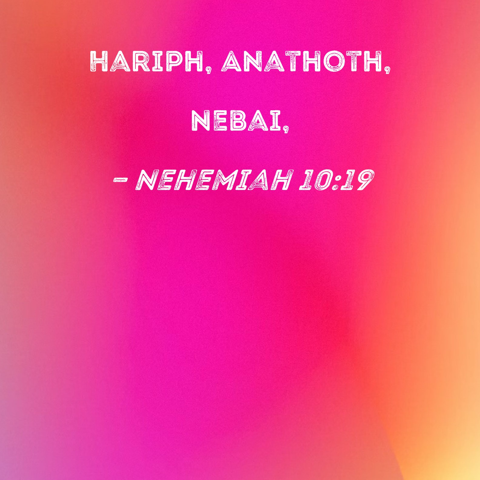 BSB: Hariph, Anathoth, Nebai, KJV: Hariph, Anathoth, Nebai, DRB: Hareph, Anathoth, Nebai, DBT: Hariph, Anathoth, Nebai, ERV: Hariph, Anathoth, Nobai; WBT: Hariph, Anathoth, Nebai, WEB: Hariph, Anathoth, Nobai, YLT: Hariph, Anathoth, Nebai,Links Nehemiah 10:19 NIV • Nehemiah 10:19 NLT • Nehemiah 10:19 ESV • Nehemiah 10:19 NASB • Nehemiah 10:19 KJV • Nehemiah 10:19 Interlinear • Nehemiah 10:19 Commentaries • Nehemiah 10:19 Parallel Texts • Nehemiah 10:19 Bible Apps • Nehemiah 10:19 Parallel • Bible Hub |