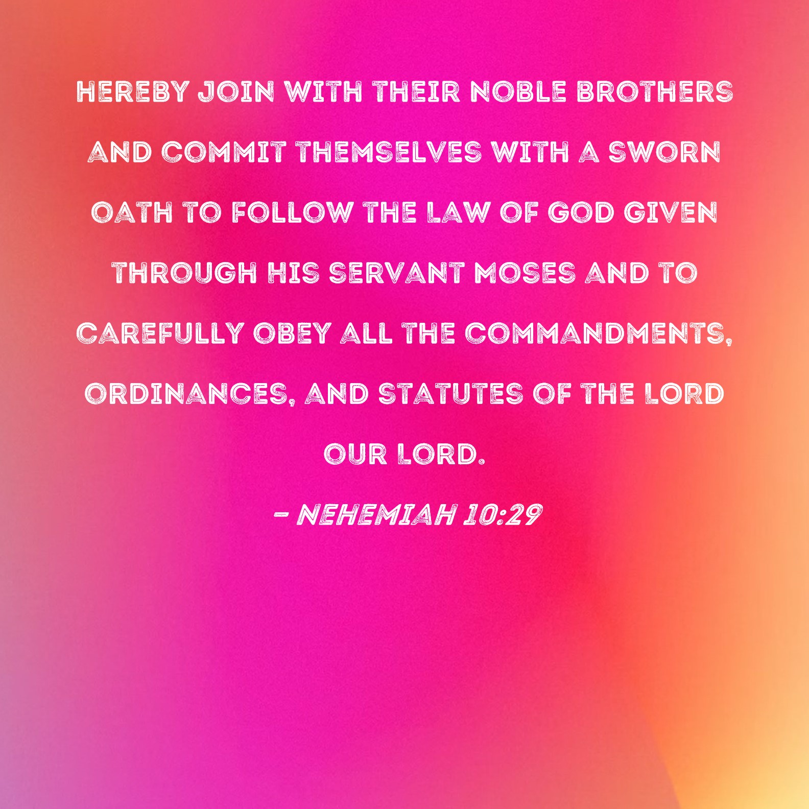 Nehemiah 10:29 hereby join with their noble brothers and commit themselves with a sworn oath to follow the Law of God given through His servant Moses and to carefully obey all the commandments, ordinances, and statutes of the LORD our Lord.