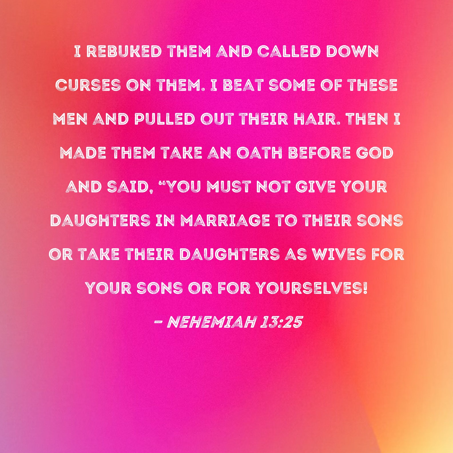 Nehemiah 13:25 I rebuked them and called down curses on them. I beat some of these men and pulled out their hair. Then I made them take an oath before God and said, "You must not give your daughters in marriage to their sons or take their daughters as wives for your sons or for yourselves!