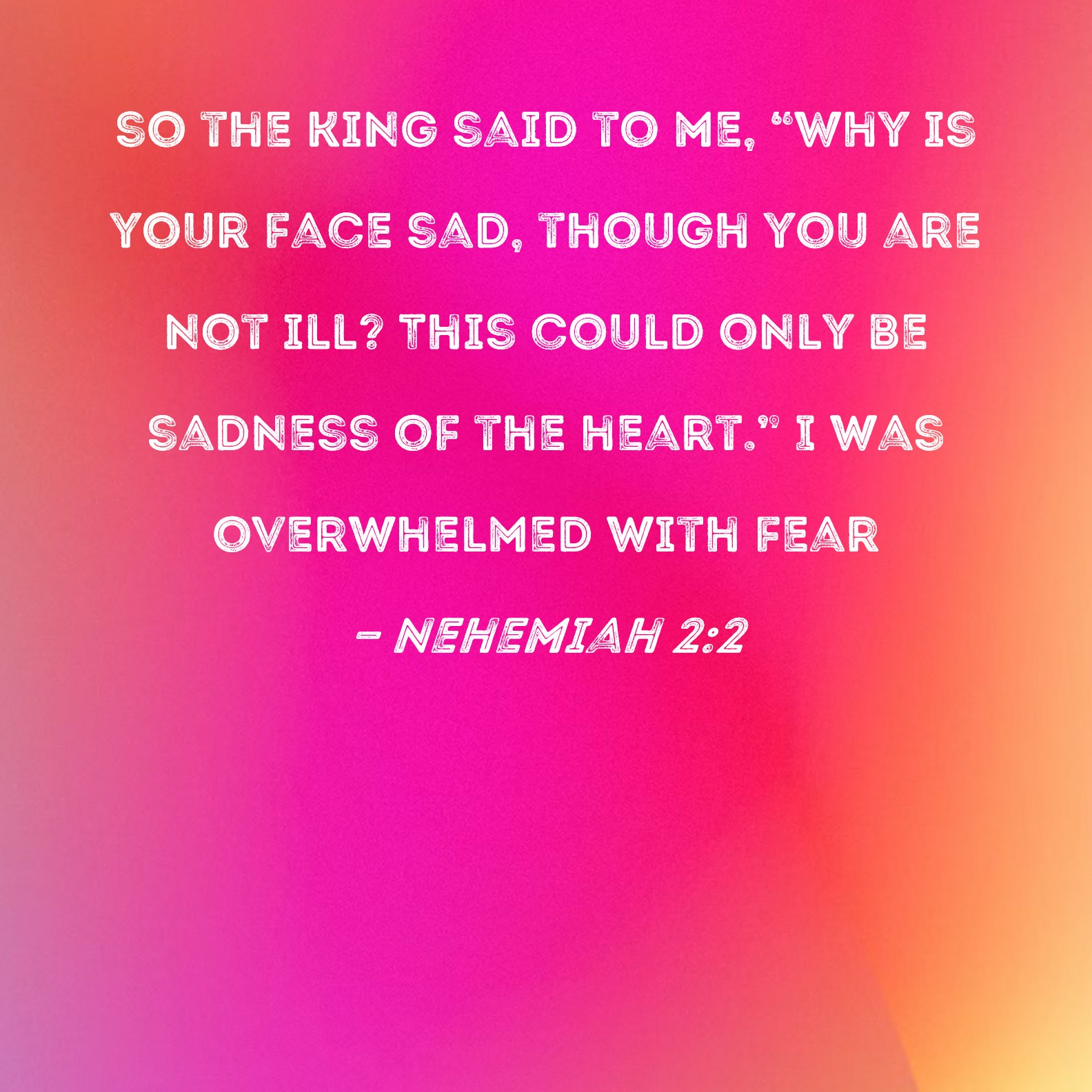 Nehemiah 2:2 so the king said to me, "Why is your face sad, though you are not ill? This could only be sadness of the heart." I was overwhelmed with fear