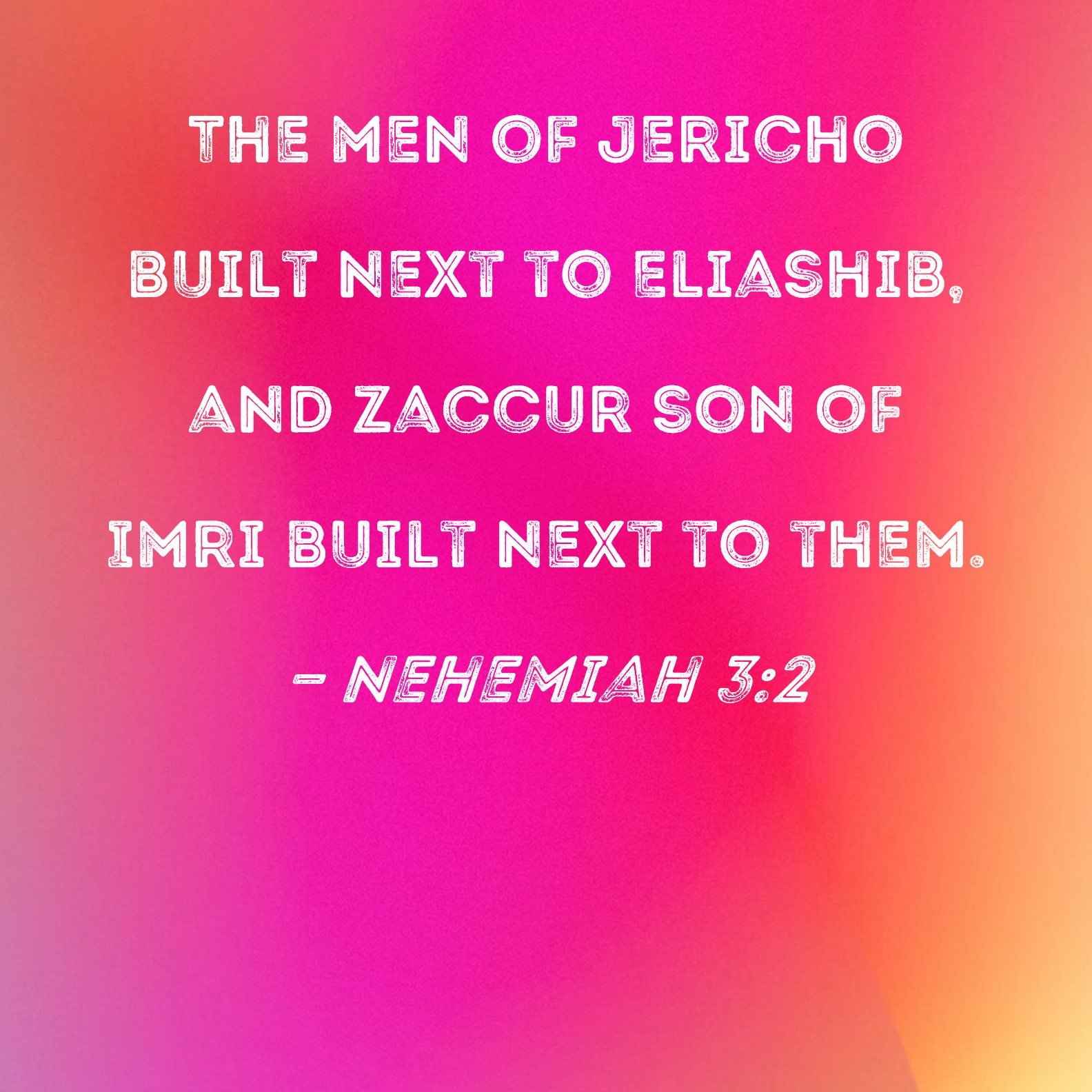 Nehemiah 3:2 The men of Jericho built next to Eliashib, and Zaccur son of Imri built next to them.