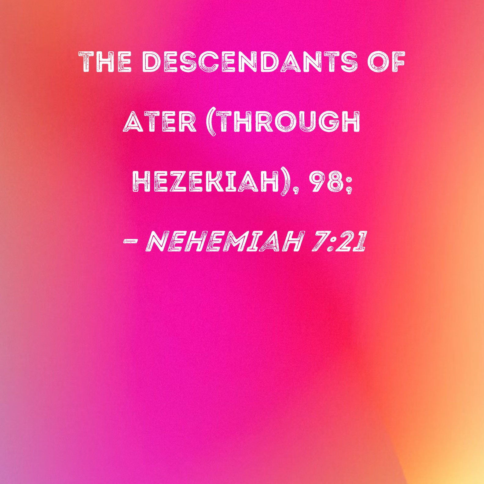 BSB: the descendants of Ater (through Hezekiah), 98; KJV: The children of Ater of Hezekiah, ninety and eight. DRB: The children of Ater, children of Hezechias, ninety-eight. DBT: The children of Ater of the family of Hezekiah, ninety-eight. ERV: The children of Ater, of Hezekiah, ninety and eight. WBT: The children of Ater of Hezekiah, ninety eight. WEB: The children of Ater: of Hezekiah, ninety-eight. YLT: Sons of Ater of Hezekiah: ninety and eight.Links Nehemiah 7:21 NIV • Nehemiah 7:21 NLT • Nehemiah 7:21 ESV • Nehemiah 7:21 NASB • Nehemiah 7:21 KJV • Nehemiah 7:21 Interlinear • Nehemiah 7:21 Commentaries • Nehemiah 7:21 Parallel Texts • Nehemiah 7:21 Bible Apps • Nehemiah 7:21 Parallel • Bible Hub |