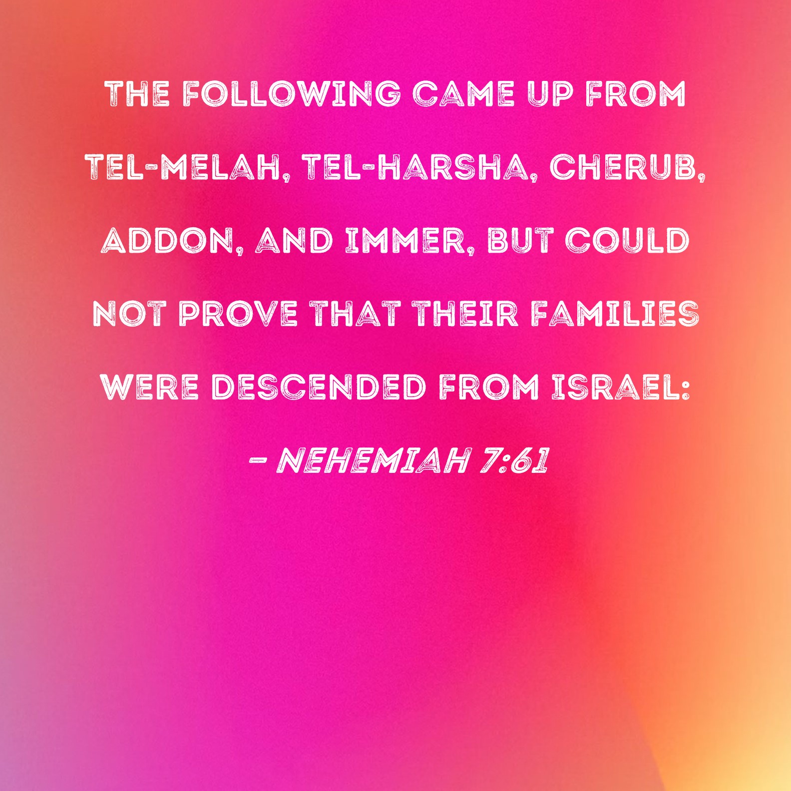 Nehemiah 7:61 The following came up from Tel-melah, Tel-harsha, Cherub, Addon, and Immer, but could not prove that their families were descended from Israel: