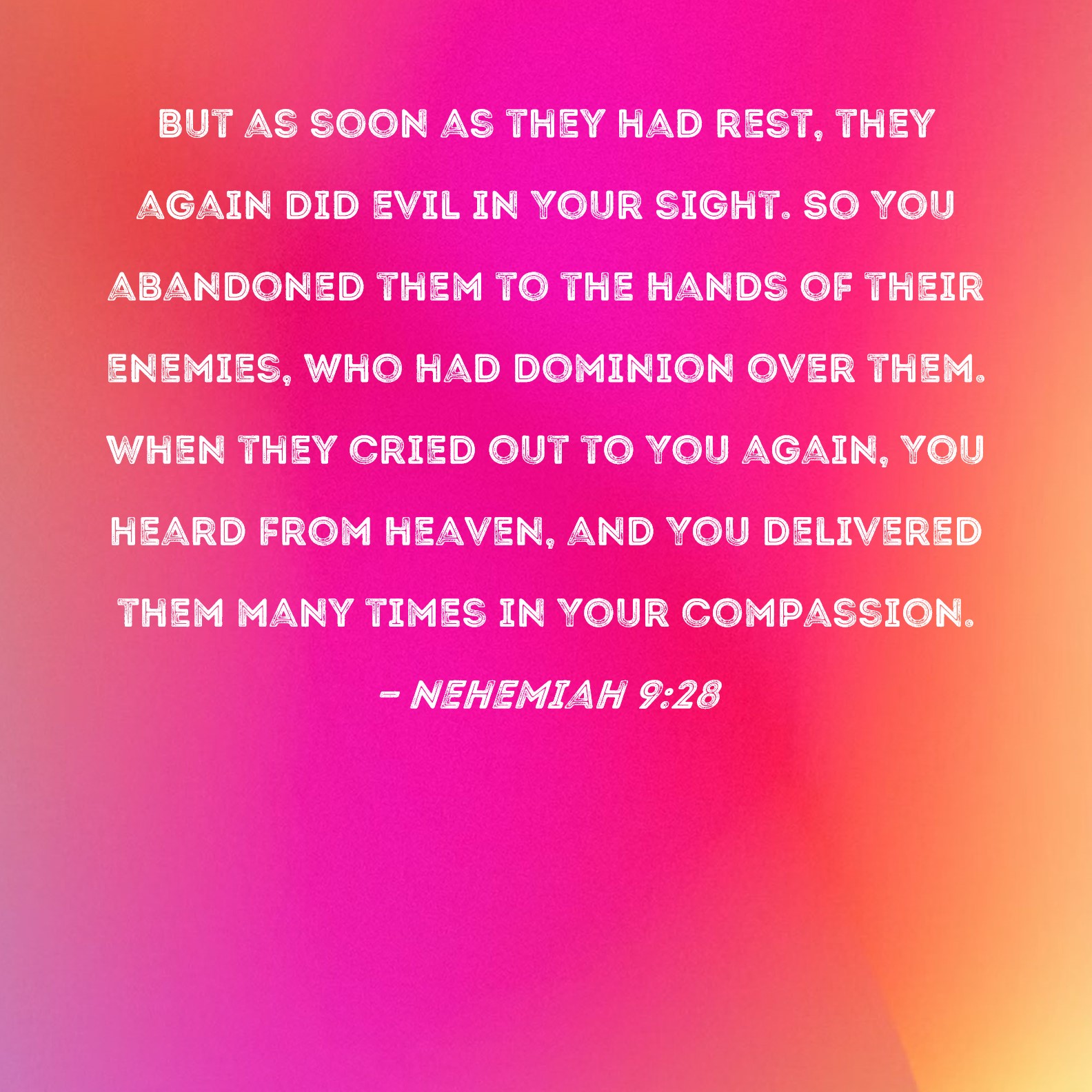 Nehemiah 9:28 But as soon as they had rest, they again did evil in Your sight. So You abandoned them to the hands of their enemies, who had dominion over them. When they cried out to You again, You heard from heaven, and You delivered them many times in Your compassion.