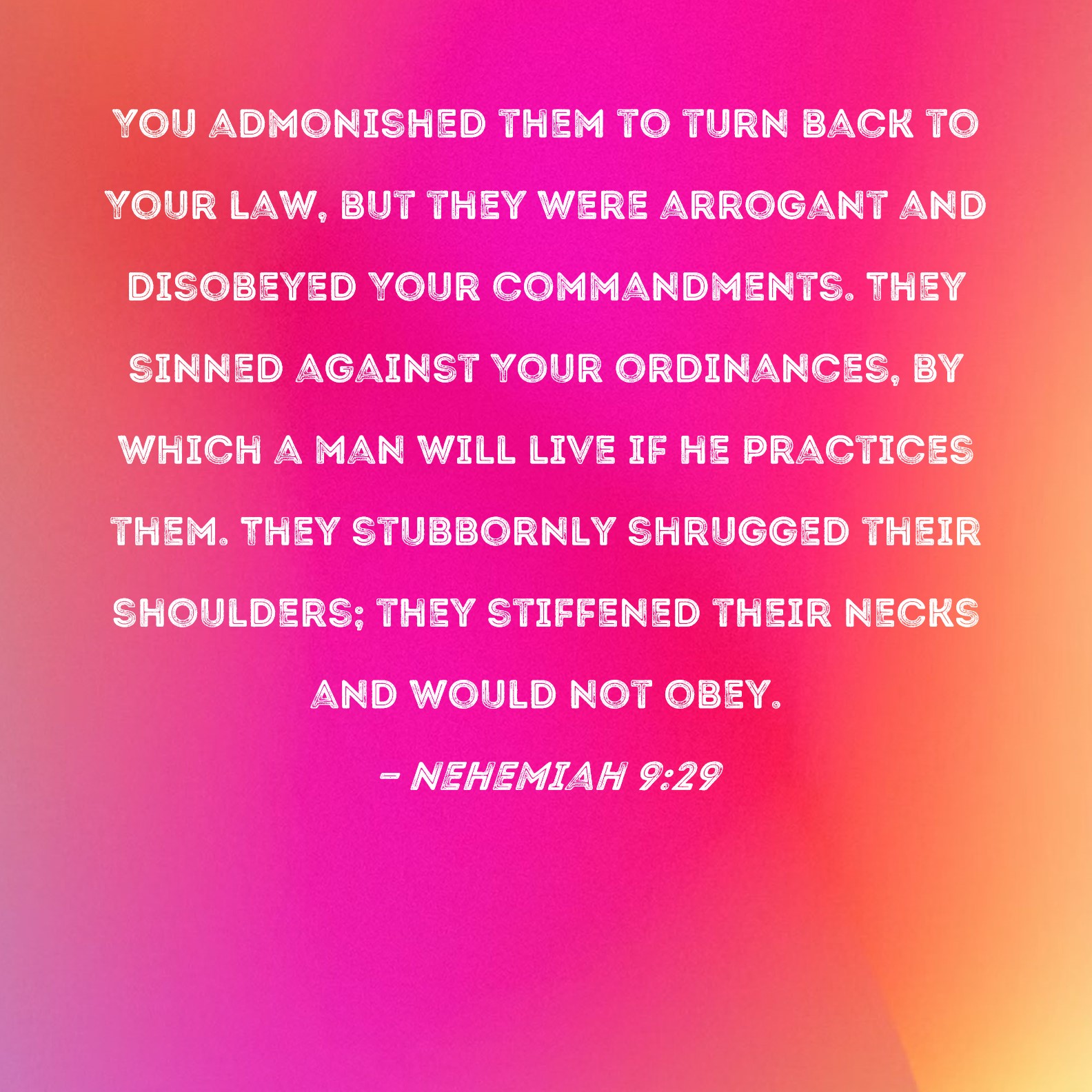 Nehemiah 9:29 You admonished them to turn back to Your law, but they were arrogant and disobeyed Your commandments. They sinned against Your ordinances, by which a man will live if he practices them. They stubbornly shrugged their shoulders; they stiffened their necks and would not obey.