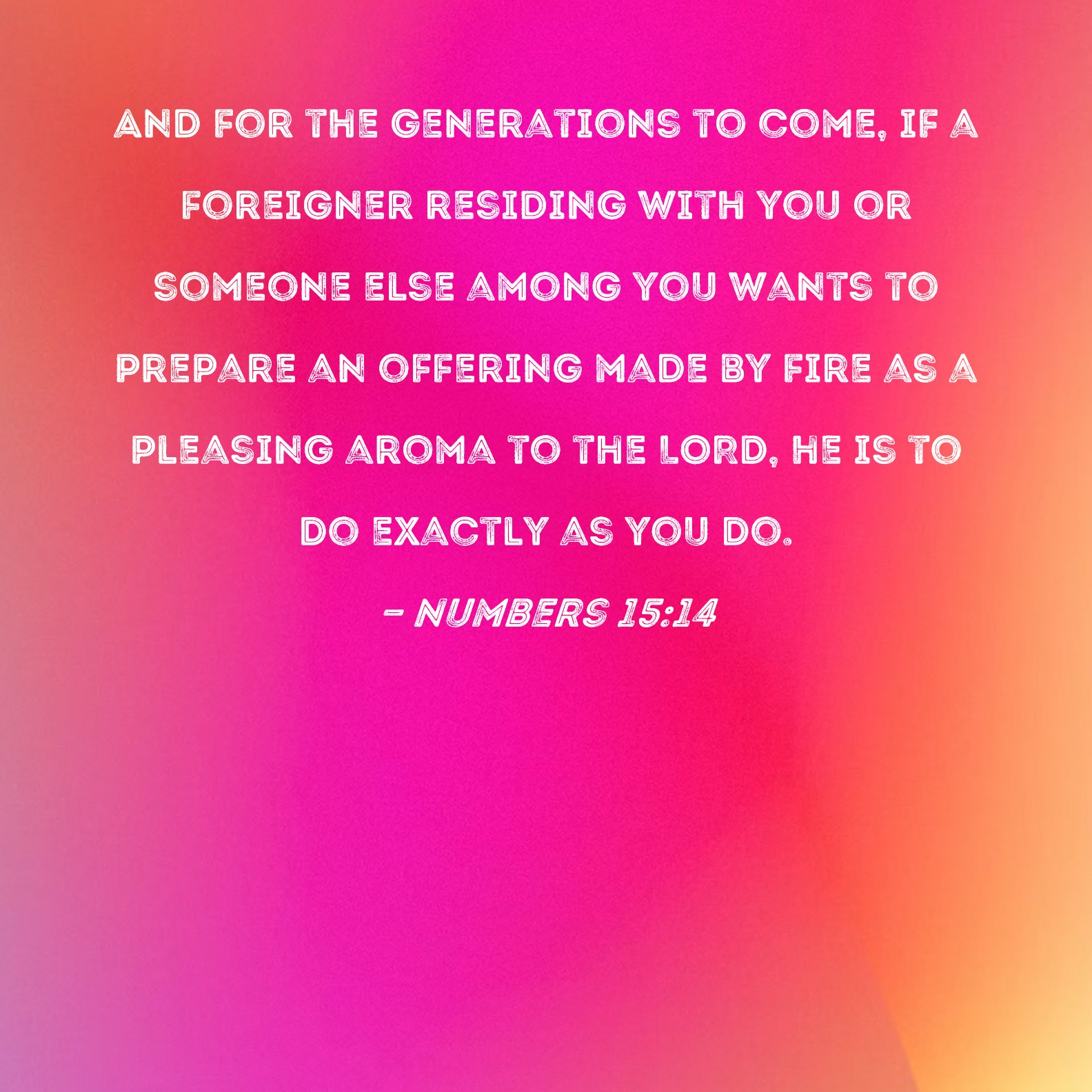 Numbers 15:14 And for the generations to come, if a foreigner residing with you or someone else among you wants to prepare an offering made by fire as a pleasing aroma to the LORD, he is to do exactly as you do.