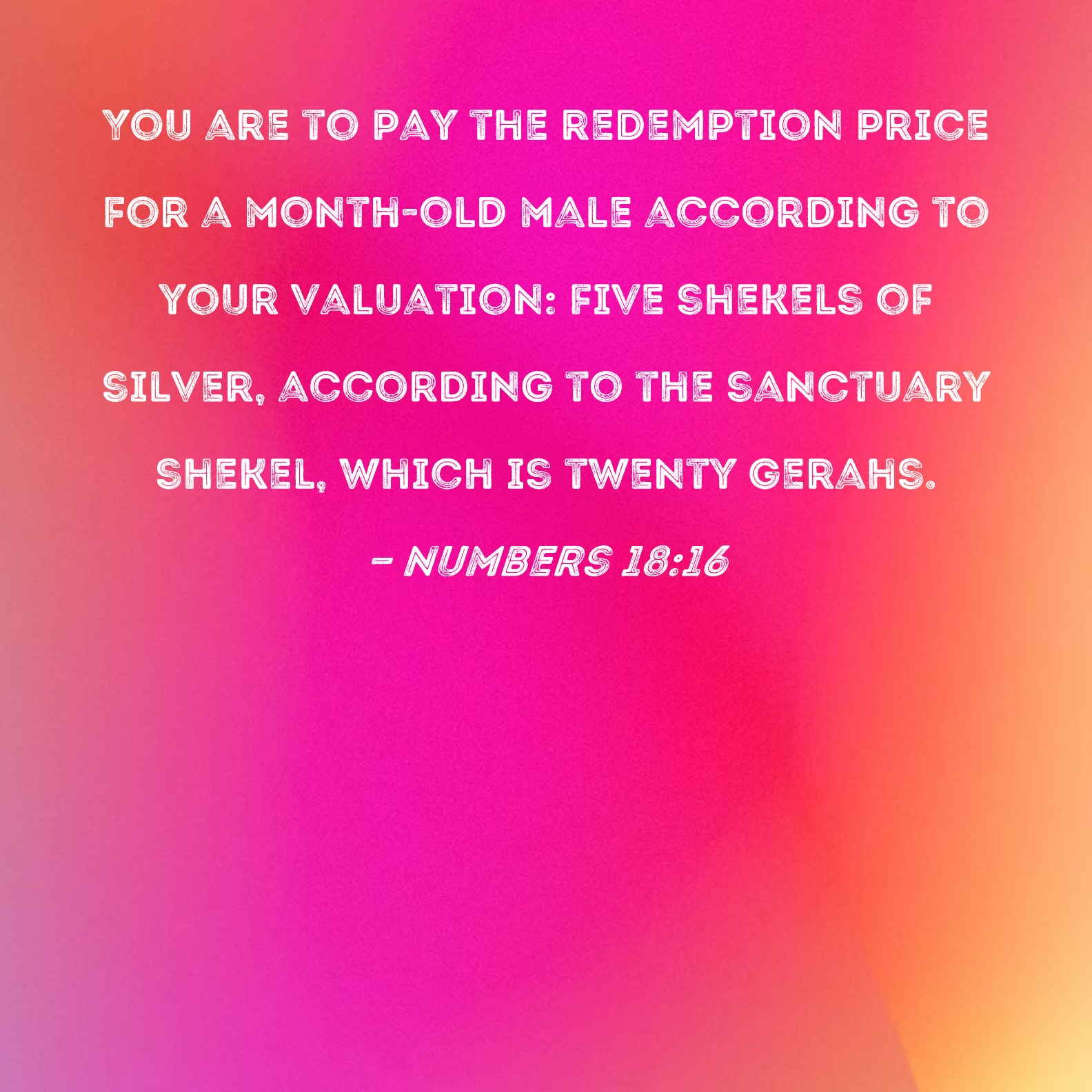 Numbers 18:16 You are to pay the redemption price for a month-old male according to your valuation: five shekels of silver, according to the sanctuary shekel, which is twenty gerahs.