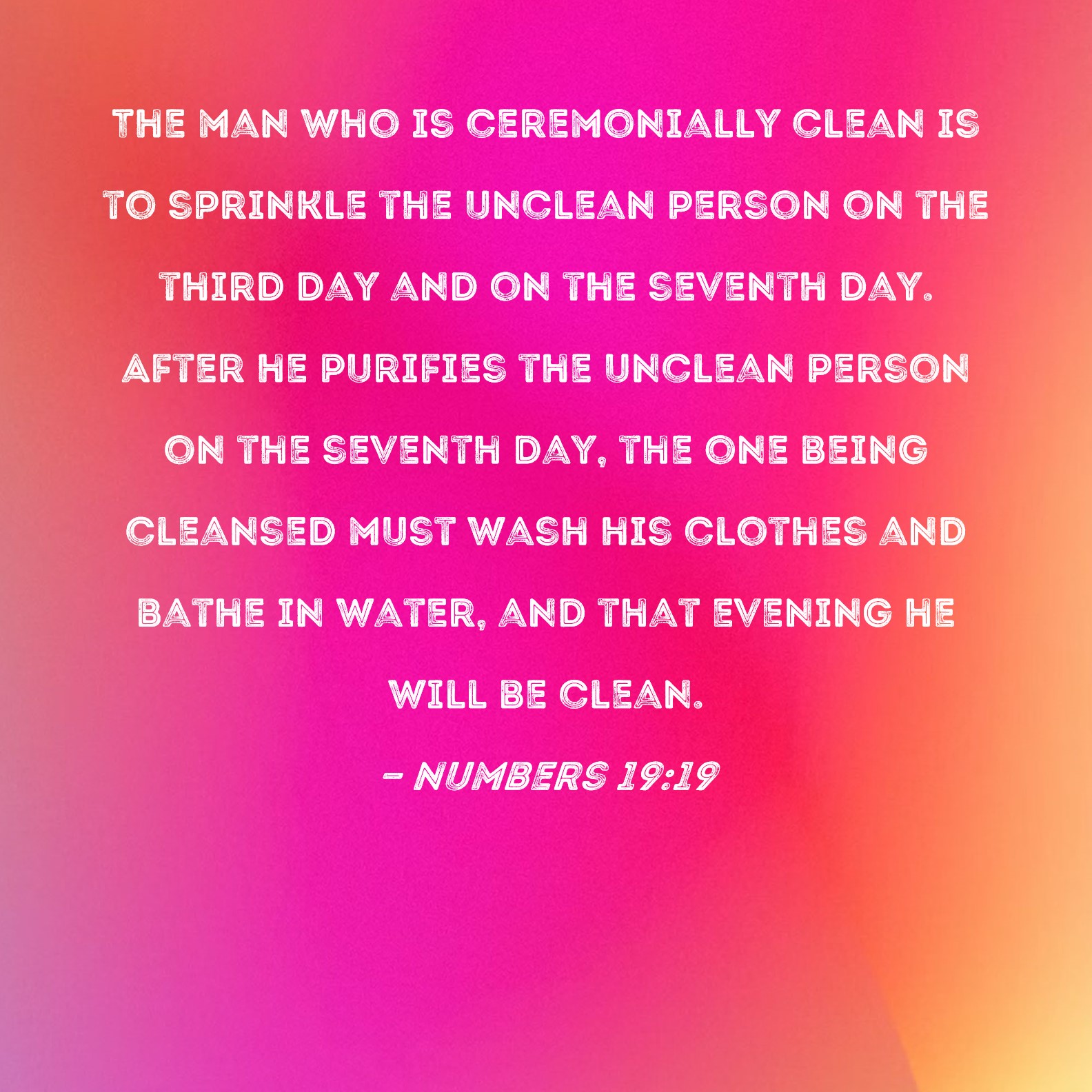 Numbers 19:19 The man who is ceremonially clean is to sprinkle the unclean person on the third day and on the seventh day. After he purifies the unclean person on the seventh day, the one being cleansed must wash his clothes and bathe in water, and that evening he will be clean.