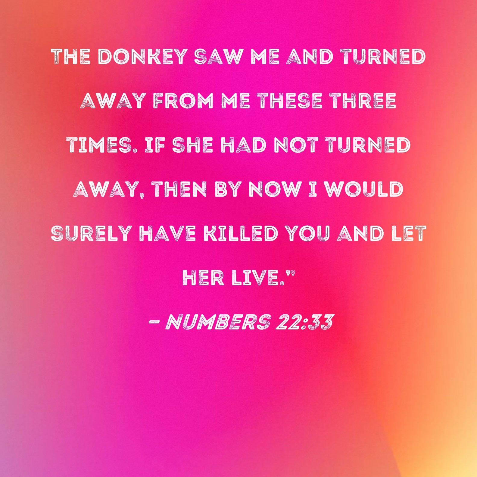 Numbers 22:33 The donkey saw me and turned away from me these three times. If she had not turned away, then by now I would surely have killed you and let her live."