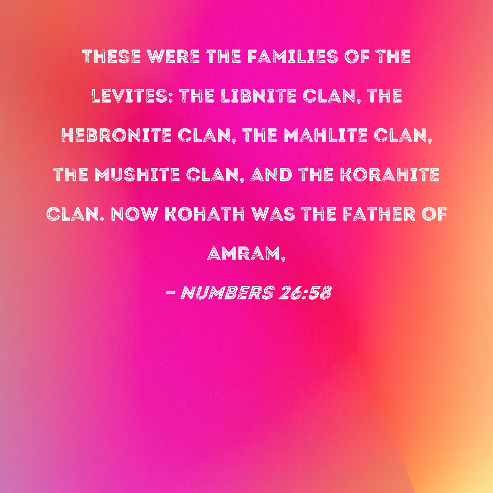 Numbers 26:58 These were the families of the Levites: The Libnite clan, the Hebronite clan, the Mahlite clan, the Mushite clan, and the Korahite clan. Now Kohath was the father of Amram,
