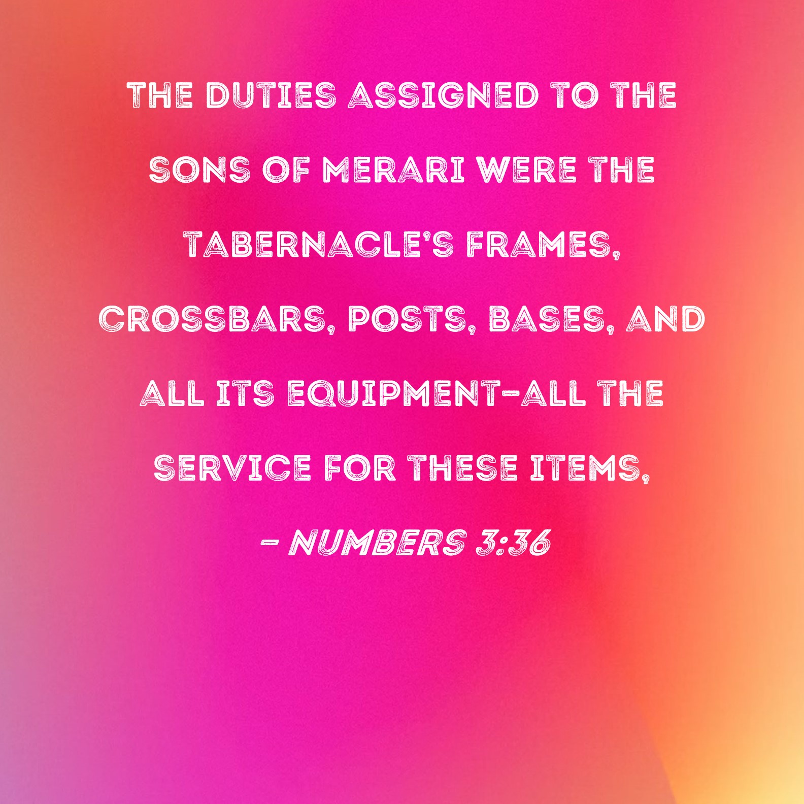 Numbers 3:36 The duties assigned to the sons of Merari were the tabernacle's frames, crossbars, posts, bases, and all its equipment--all the service for these items,