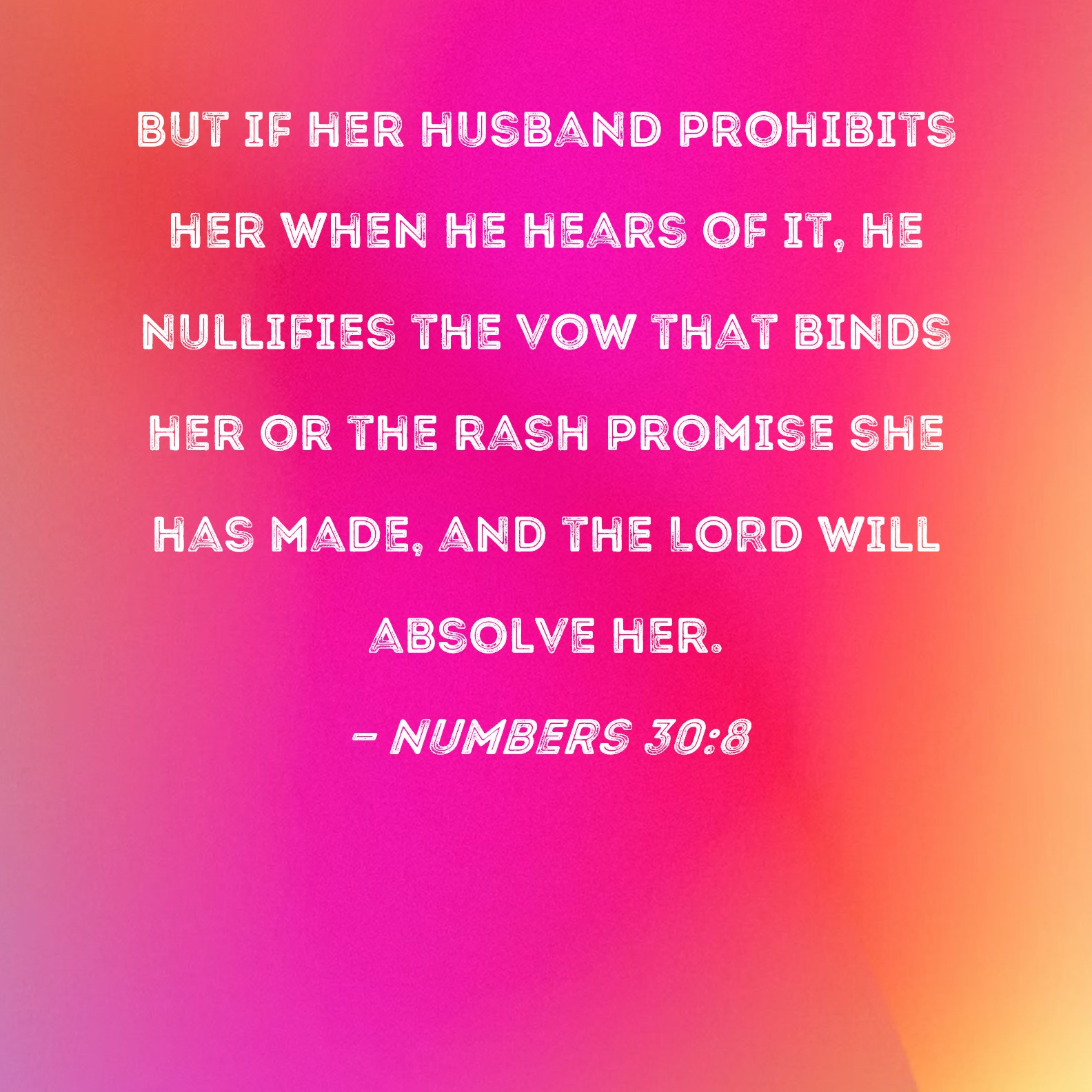 Numbers 30:8 But if her husband prohibits her when he hears of it, he nullifies the vow that binds her or the rash promise she has made, and the LORD will absolve her.