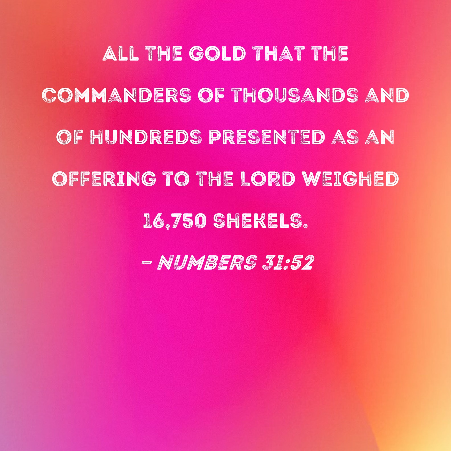 Numbers 31:52 All the gold that the commanders of thousands and of hundreds presented as an offering to the LORD weighed 16,750 shekels.