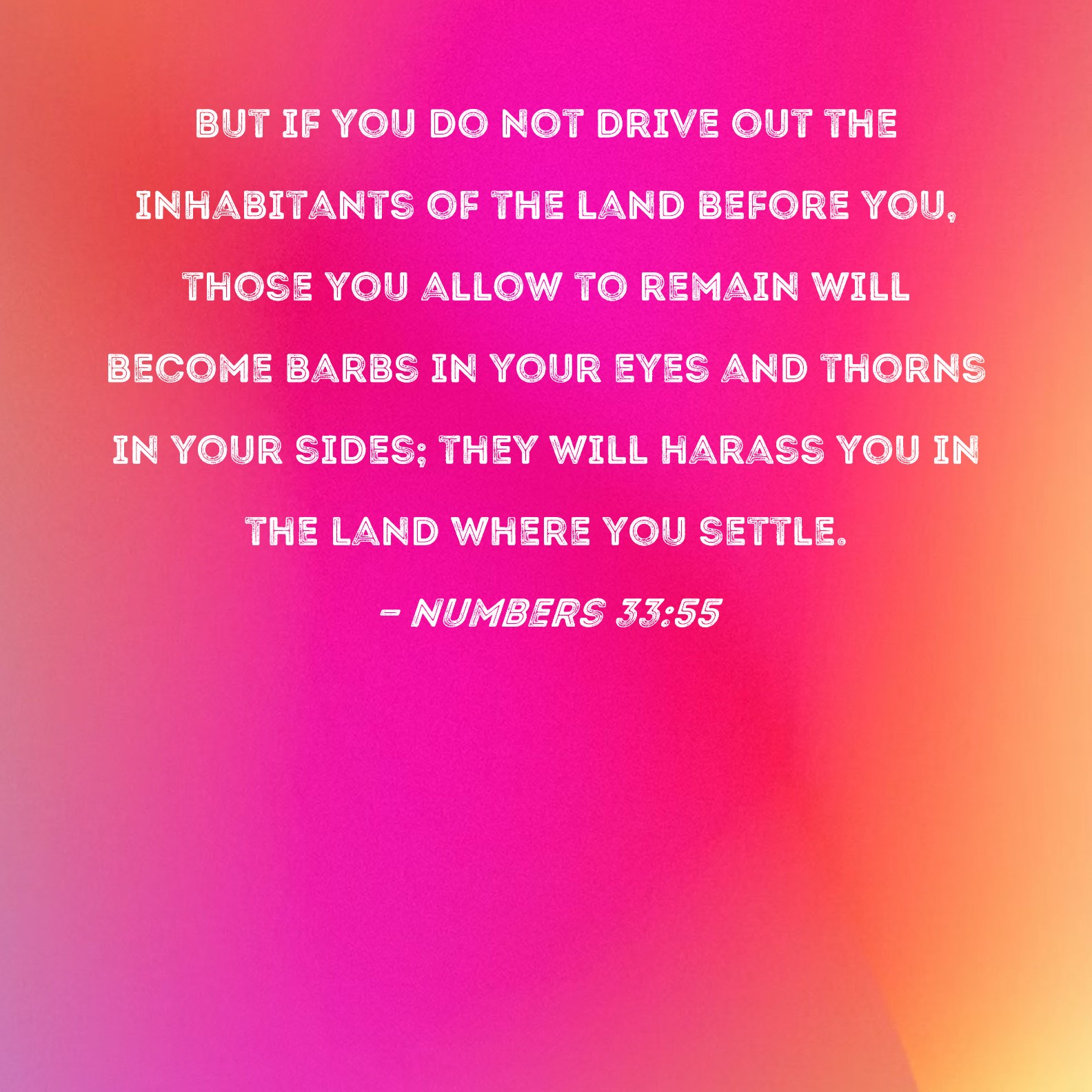 Numbers 33:55 But if you do not drive out the inhabitants of the land before you, those you allow to remain will become barbs in your eyes and thorns in your sides; they will harass you in the land where you settle.